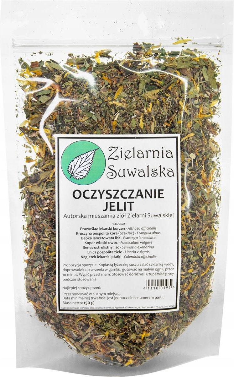 Jelitodetox – naturalne oczyszczenie jelit 150 g Jelitodetox to autorska mieszanka ziołowa stworzona z myślą o naturalnym wsparciu układu pokarmowego – szczególnie jelit. Znana wcześniej jako „Oczyszczanie jelit”, receptura powstała na bazie wieloletniej praktyki zielarskiej oraz wiedzy akademickiej i została przetestowana przez tysiące użytkowników na całym świecie. Zioła, które działają Każdy składnik tej mieszanki ma konkretne zadanie: Senes i kruszyna – tradycyjnie stosowane przy zaparciach, wspomagają regularne wypróżnienia, Prawoślaz i babka lancetowata – łagodzą śluzówkę jelit, wspierają regenerację i działają osłonowo, Koper włoski – redukuje wzdęcia, wspiera trawienie, Lnica i nagietek – wspomagają oczyszczanie organizmu z toksyn i działają przeciwzapalnie. Korzyści dla Twojego organizmu Naturalne wsparcie detoksykacji Pomoc przy nieregularnych wypróżnieniach i zaparciach Wspomaganie perystaltyki jelit Ukojenie dla układu pokarmowego W 100% roślinny i bez dodatków chemicznych Dla kogo? Jelitodetox to idealna propozycja dla osób: zmagających się z przewlekłymi zaparciami, szukających łagodnej alternatywy dla środków przeczyszczających, przeprowadzających kurację oczyszczającą lub detoks organizmu. Dodatkowe informacje Żadnych informacji na stronie nie można traktować jako zaleceń medycznych! Data minimalnej trwałości jest jednocześnie numerem partii i jest zawarta na etykiecie produktu – w celu potwierdzenia daty przydatności prosimy o kontakt. Zasady przechowywania: przechowywać w suchym miejscu. Wyprodukowano w Polsce dla: Zielarnia Suwalska Agnieszka Żukowska, ul. Kościuszki 112C/U2, 16-400 Suwałki