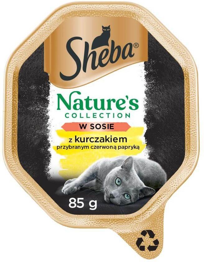 SHEBA Nature’s Collection tacka 85 g – mokra karma pełnoporcjowa dla dorosłych kotów, kawałki z kurczakiem przybranym czerwoną papryką, w Sheba® Nature’s Collection to mieszanka starannie wyselekcjonowanych, delikatnych kawałków w wykwintnym sosie. Propozycja posiłków z kawałkami z kurczakiem przybranym czerwoną papryką zachwyci podniebienia nawet najbardziej wymagających kotów. Mistrzowsko przygotowane posiłki z naturalnych składników wysokiej jakości, z witaminami oraz minerałami. Te bezzbożowe receptury oczarują Twojego kota tym, co najlepsze z natury. W każdej tacce znajdują się składniki odżywcze, wspierające prawidłowe funkcjonowanie Twojego kota. Pozwól swojemu kotu na kulinarną rozkosz, aby mógł delektować się pyszną karmą Sheba® Nature’s Collection, która zaspokoi nawet najbardziej wybredny apetyt. Korzyści Zawiera naturalne* składniki oraz witaminy i minerały. Kusząca receptura z kawałkami, które Twój kot pokocha. Zapewnia dodatkową porcję wody w trosce o zdrowie dróg moczowych kociego przyjaciela. Ta pełnoporcjowa karma nie ma w swoim składzie zbóż. Kompletny i zbilansowany pokarm dla kota, aby utrzymać jego witalność i sprawność każdego dnia. Wygodne opakowanie w formie tacki, nadające się w 100% do recyklingu. Skład: mięso i produkty pochodzenia zwierzęcego* (94% naturalnego pochodzenia; w tym kurczak 4% w kawałkach**), warzywa* (w tym mieszanka czerwonej papryki, marchewki i groszku 4%), produkty pochodzenia roślinnego*, substancje mineralne, drożdże*, cukry. *Składniki naturalnego pochodzenia. **Kawałki stanowią 44% produktu. Kaloryczność: 69 kcal/85 g Dodatki/1 kg: Dodatki dietetyczne: Witamina D3: 200 IU, Tauryna: 620 mg, Miedź (siarczan miedzi (II), pięciowodny): 1,3 mg, Jod (jodan wapnia, bezwodny): 0,34 mg, Żelazo (siarczan żelaza (II), jednowodny): 16,8 mg, Mangan (siarczan manganawy, jednowodny): 3,4 mg, Cynk (siarczan cynku, jednowodny): 16,2 mg. Składniki analityczne (%): białko: 7,9; zawartość tłuszczu: 5,0; materia nieorganiczna: 1,5; włókno surowe: 0,20; wilgotność: 83,5. Sposób karmienia Zalecana dzienna ilość karmy dla kota: Kot o masie ciała 3 kg potrzebuje 2,5-3 tacek dziennie. Kot o masie ciała 4 kg potrzebuje 3-3,5 tacki dziennie. Kot o masie ciała 5 kg potrzebuje 3,5-4 tacek dziennie. 1 tackę można zastąpić 18-20 g karmy suchej. Należy uwzględnić kalorie pochodzące z przysmaków. Ilości karmy są podane wyłącznie jako wskazówki. Należy dostosować ilość karmy do wieku, rozmiaru i poziomu aktywności kota. Zapewnij świeżą wodę do picia. Podawać o temperaturze pokojowej, niewykorzystaną część przechowywać w lodówce do 2 dni.