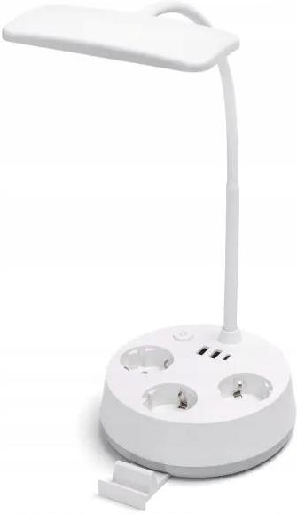 Lampka biurkowa LED z gniazdkami i portami USB – 4.6W | 450lm | Biała Parametry techniczne Moc: 4.6 W Barwa światła: 3000K / 4000K / 6500K (ciepła, neutralna, zimna) Strumień świetlny: 450 lm Zasilanie: 220–240V~ Wymiary: 220 × 144,5 × 308 mm Materiał: PC Kolor: Biały Nowoczesna i funkcjonalna lampka biurkowa LED łącząca w sobie oświetlenie i rozdzielacz zasilania. Wyposażona w trzy gniazda sieciowe, porty USB oraz przycisk zasilania, idealnie sprawdzi się w biurze, domowym gabinecie czy na stanowisku gamingowym. Elastyczne ramię pozwala na precyzyjne ustawienie światła, a stabilna podstawa zwiększa bezpieczeństwo użytkowania. Funkcje dodatkowe 3 gniazda zasilające 230V 3 porty USB do ładowania urządzeń mobilnych Elastyczne ramię lampki Przycisk ON/OFF Podstawka na telefon