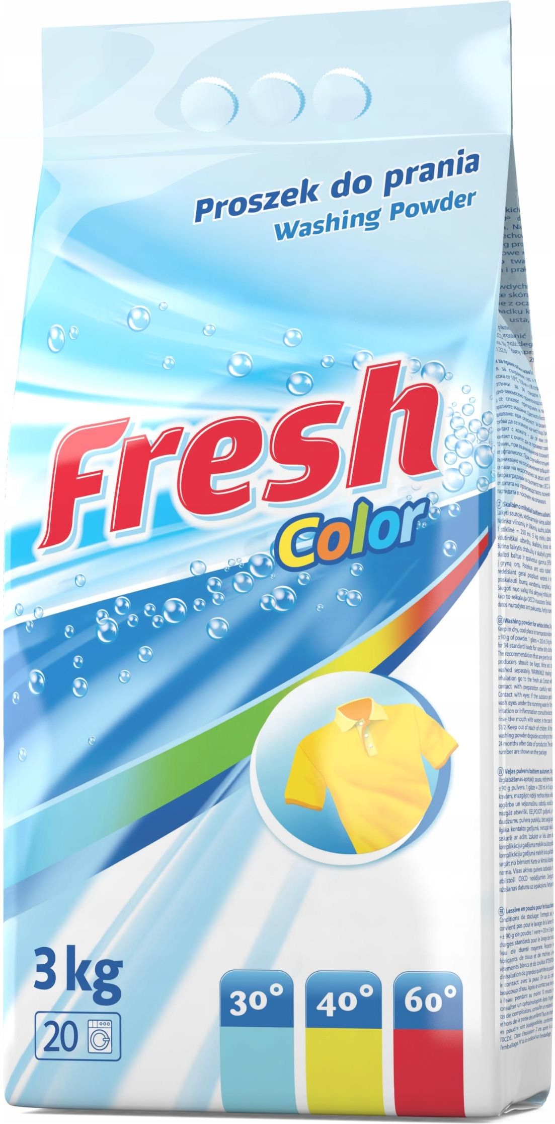 PROSZEK DO PRANIA FRESH COLOR 3 KG Proszek przeznaczony do prania we wszystkich typach pralek, a także do prania ręcznego w temp. Proszek do prania stworzony zgodnie z wysokimi standardami jakości. Teraz proszek w nowej lepszej formule! Substancje czynne zawarte w produkcie pozostają aktywne zarówno w 30°C, jak i w 60°C. Dzięki specjalnej formule można stosować go w praniu tkanin kolorowych Proszek jest bardzo wydajny. Jedno opakowanie starcza 20 prań! Stworzony dla konsumentów, którzy cenią sobie wygodę i korzystne cenowo rozwiązanie. Jedno opakowanie proszku starczy na długo. Pozwoli Ci dłużej cieszyć się świeżym praniem i zaoszczędzi Twoje pieniądze. Doskonale sprawdzi się z praniu ręcznym oraz możesz używać w pralkach automatycznych. Proszek zawiera enzymy , które usuwają zabrudzenia. Polimery zawarte w proszku chronią kolory Twoich tkanin i pozwalają dłużej cieszyć się ubraniami.