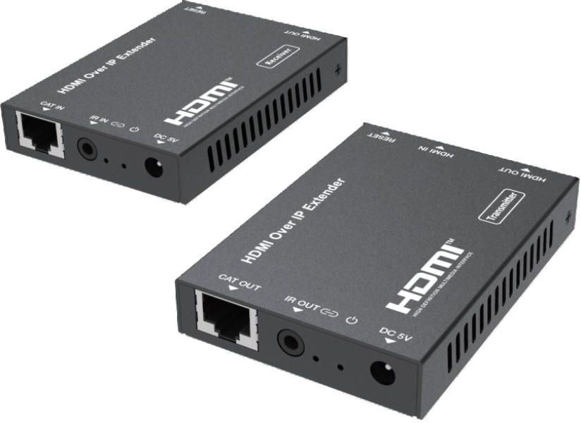Extender HDMI na IP po kablu Cat5e/6 do 150m. Obsługuje rozdzielczości do 1920x1200 60Hz, kompresja H.265/H.264, wyjście HDMI Loop, przesył IR, zarządzenie z PC, praca w trybie unicast lub multicast, wsparcie VLC, zestaw nadajnik + odbiornik
