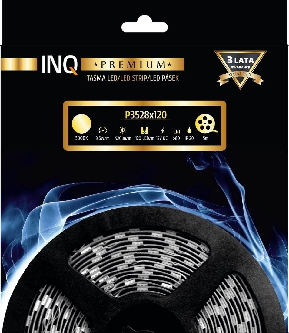 Taśmy LED PREMIUM firmy INQ to najlepszy wybór dla najbardziej wymagających użytkowników. Seria taśm PREMIUM gwarantuje najwyższą jakość produktu, długą żywotność, a także wysoką efektywność. Dzięki temu serię taśm PREMIUM cechuje przedłużona gwarancja do 36 miesięcy. Taśma może być stosowana jako światło dekoracyjne, a także jako główne lub dodatkowe światło w nowoczesnych aranżacjach opraw liniowych, sufitach podwieszanych, oświetleniu mebli, blatów kuchennych lub w wielu innych miejscach. Wszystkie taśmy INQ są wyposażone w dwustronną taśmę 3M, która gwarantuje prosty i łatwy montaż na wybranej powierzchni oraz zapewnia jej bezproblemową pracę. Dzięki swojej uniwersalnej budowie można ją ciąć na dowolne odcinki co 2,5cm. Do podłączenia taśmy do zasilania sieciowego 230V niezbędne jest zastosowanie zasilacza LED 12V o mocy nie niższej niż moc taśmy, lub jej odcinków. Wystarczy zlutować ze sobą dwa odcinki taśmy LED lub przewody w wyznaczonym do tego miejscu aby połączyć taśmę z zasilaczem. Moc: 9.6W/m Stopień szczelności: IP20 Strumień świetlny: 920lm/m Temperatura barwowa: 3000K - barwa ciepła Rodzaj źródła światła: LED Gwarancja: 36 miesięcy Zgodność z normami: CE Seria: Premium Prąd znamionowy: 0,8A/m Klasa ochronności: III Żywotność: 25 000h