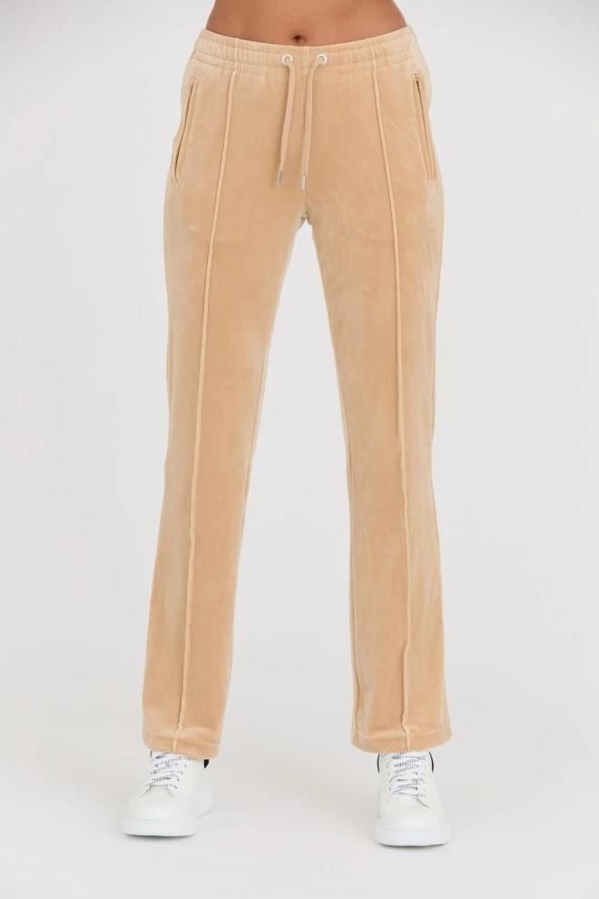 Beżowe damskie spodnie dresowe Tina Track Pants, marki JUICY COUTURE. Wymiary modelki: wzrost 176 cm, biust 85 cm, talia 65 cm, biodra 92 cm. Modelka ma na sobie produkt w rozmiarze S.