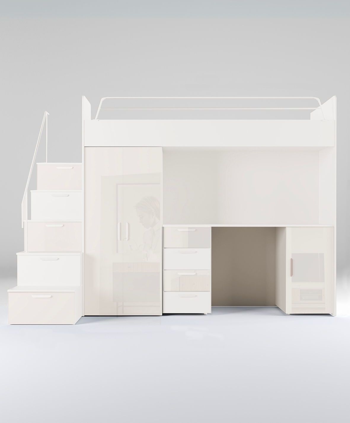 Meblościanka Raj 4 to kompleksowy system meblowy typu "wszystko w jednym", stworzony z myślą o maksymalnym wykorzystaniu przestrzeni w pokoju dziecięcym lub młodzieżowym.Funkcjonalne rozwiązania, przemyślany układ i nowoczesna forma sprawiają, że jest to idealna propozycja do mniejszych wnętrz.System zawiera:- łóżko piętrowe (na górze) ze stelażem i materacem,- biurko z szufladami i szafką (w centralnej części),- pojemną szafę ubraniową,- praktyczne schody z szufladami w stopniachObciążenie górnego łóżka wynosi do 75 kg.Fronty zestawu są wykonane z płyty meblowej MDF połysk.Korpus łóżka jest wykonany z odpornej na zarysowania płyty laminowanej w kolorze białym o grubości 16 mm.Łóżko może być złożone w wersji ze schodkami z prawej lub z lewej strony (podczas montażu samemu decyduje się z której strony ma być wejście na łóżko).Szuflady biurka można zamontować po lewej lub prawej stronie.Stelaż łóżka jest wykonany z ramy ze sklejki bukowej dzięki czemu jest on bardzo wytrzymały. Stelaż posiada 21 listew sprężynujących.Uchwyty wykonane są z tworzywa PCV.To wszystko w jednym spójnym zestawie, który pozwala urządzić cały pokój w sposób funkcjonalny i estetyczny.Raj 4 dostępny jest w 8 modnych wariantach kolorystycznych, szafki są wykończone na wysoki połysk:- biały + fiolet- biały + biały- biały + beż- biały + czarny - biały + szary- biały + niebieski- biały + róż- biały + zielonyKorpus w uniwersalnej bieli harmonijnie łączy się z barwnymi frontami, nadając meblom świeżość i styl.Model objęty jest 2 letnią gwarancją producenta.Produkt dostarczymy do Państwa BEZPŁATNIE pod wskazany adres na terenie całego kraju.Mebel wymaga samodzielnego montażu, zgodnie z załączoną instrukcją.Co WAŻNE: zgodnie z prawem i naszymregulaminemmają Państwo pełne prawo do zwrotu nieużywanych towarów, jeśli nie spełnią one Państwa oczekiwań. Wymiary: