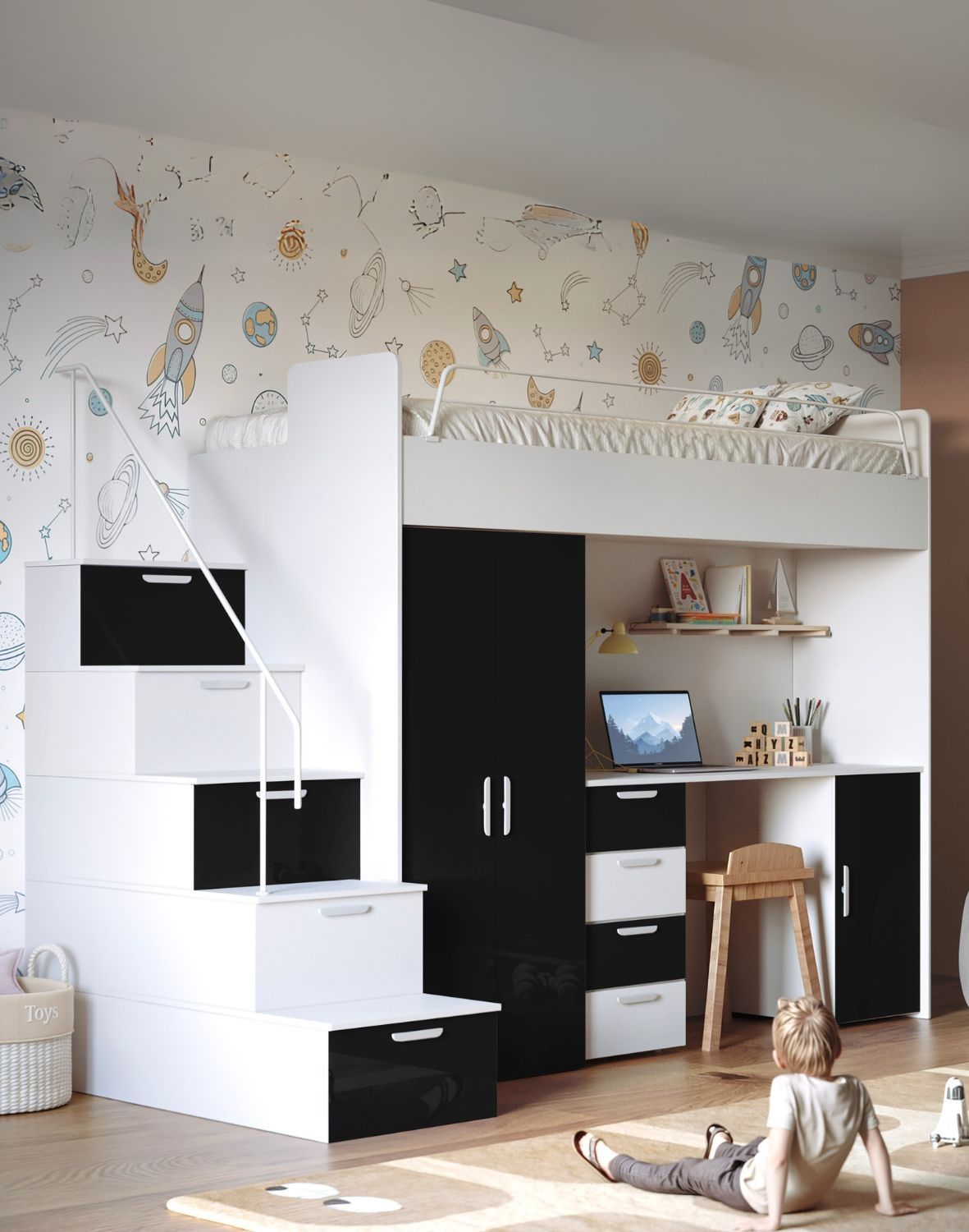 Meblościanka Raj 4 to kompleksowy system meblowy typu "wszystko w jednym", stworzony z myślą o maksymalnym wykorzystaniu przestrzeni w pokoju dziecięcym lub młodzieżowym.Funkcjonalne rozwiązania, przemyślany układ i nowoczesna forma sprawiają, że jest to idealna propozycja do mniejszych wnętrz.System zawiera:- łóżko piętrowe (na górze) ze stelażem i materacem,- biurko z szufladami i szafką (w centralnej części),- pojemną szafę ubraniową,- praktyczne schody z szufladami w stopniachObciążenie górnego łóżka wynosi do 75 kg.Fronty zestawu są wykonane z płyty meblowej MDF połysk.Korpus łóżka jest wykonany z odpornej na zarysowania płyty laminowanej w kolorze białym o grubości 16 mm.Łóżko może być złożone w wersji ze schodkami z prawej lub z lewej strony (podczas montażu samemu decyduje się z której strony ma być wejście na łóżko).Szuflady biurka można zamontować po lewej lub prawej stronie.Stelaż łóżka jest wykonany z ramy ze sklejki bukowej dzięki czemu jest on bardzo wytrzymały. Stelaż posiada 21 listew sprężynujących.Uchwyty wykonane są z tworzywa PCV.To wszystko w jednym spójnym zestawie, który pozwala urządzić cały pokój w sposób funkcjonalny i estetyczny.Raj 4 dostępny jest w 8 modnych wariantach kolorystycznych, szafki są wykończone na wysoki połysk:- biały + fiolet- biały + biały- biały + beż- biały + czarny - biały + szary- biały + niebieski- biały + róż- biały + zielonyKorpus w uniwersalnej bieli harmonijnie łączy się z barwnymi frontami, nadając meblom świeżość i styl.Model objęty jest 2 letnią gwarancją producenta.Produkt dostarczymy do Państwa BEZPŁATNIE pod wskazany adres na terenie całego kraju.Mebel wymaga samodzielnego montażu, zgodnie z załączoną instrukcją.Co WAŻNE: zgodnie z prawem i naszymregulaminemmają Państwo pełne prawo do zwrotu nieużywanych towarów, jeśli nie spełnią one Państwa oczekiwań. Wymiary: