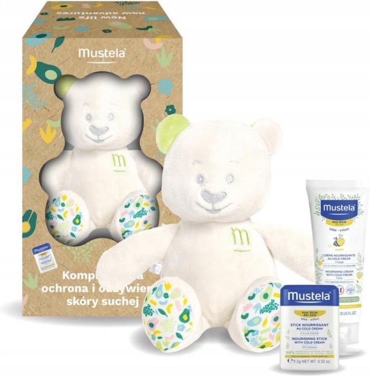 MUSTELA – Zestaw Kompleksowa ochrona i odżywienie suchej skóry + Miś Zestaw Mustela Kompleksowa ochrona i odżywienie to idealna propozycja dla rodziców, którzy chcą zapewnić skuteczną, naturalną i bezpieczną pielęgnację delikatnej skóry swojego dziecka – już od 1. dnia życia.* W jego skład wchodzą dwa doskonale uzupełniające się produkty: odżywczy sztyft ochronny oraz odżywczy krem do twarzy z Cold Cream i organicznym woskiem pszczelim. Oba kosmetyki chronią przed szkodliwymi czynnikami zewnętrznymi (wiatr, zimno, mróz), intensywnie nawilżają i regenerują suchą skórę. Do zestawu dołączono również uroczego pluszowego misia, który umili codzienne rytuały pielęgnacyjne. To doskonały wybór zarówno na sezon jesienno-zimowy, jak i jako praktyczny prezent dla świeżo upieczonych rodziców. *Z wyjątkiem wcześniaków hospitalizowanych na oddziałach neonatologii. Dla kogo? Dla noworodków, niemowląt i małych dzieci z suchą lub wrażliwą skórą, Dla rodziców poszukujących bezpiecznej pielęgnacji od pierwszych dni życia, Dla dzieci szczególnie narażonych na działanie czynników atmosferycznych – wiatr, mróz, zimno, Dla osób ceniących produkty o naturalnym składzie i wysokiej skuteczności, Dla tych, którzy chcą połączyć pielęgnację z czułym momentem bliskości – z pomocą uroczego misia. Korzyści ze stosowania: Sztyft ochronny – szybka pomoc dla najbardziej narażonych miejsc - Niewielki, poręczny sztyft zmieści się w każdej torebce czy kieszeni. Zawiera 98% składników pochodzenia roślinnego, w tym naturalny Cold Cream, lipidy, ceramidy oraz organiczne masło shea. Doskonale sprawdza się na suche partie twarzy – usta, policzki, nos – przynosząc natychmiastowe ukojenie, miękkość i ochronę przed wiatrem oraz mrozem. Idealny w podróży i na spacerze. Odżywczy krem z Cold Cream – codzienna bariera ochronna - Bogata, ale łatwo wchłaniająca się formuła kremu intensywnie odżywia i długotrwale nawilża skórę dziecka. Cold Cream i organiczny wosk pszczeli chronią skórę przed przesuszeniem i czynnikami zewnętrznymi. Krem idealnie nadaje się do stosowania dwa razy dziennie, szczególnie w chłodne dni – zapewnia skórze komfort i miękkość. Naturalny i bezpieczny skład - Oba kosmetyki zawierają niemal wyłącznie składniki pochodzenia naturalnego i są odpowiednie do stosowania już od pierwszego dnia życia. Bezpieczne także dla wcześniaków (poza oddziałem neonatologii). Nie zawierają składników pochodzenia zwierzęcego. Łatwość i przyjemność stosowania - Oba produkty mają kompaktowe opakowania – praktyczne w domu i poza nim. Aplikacja jest szybka i intuicyjna, co ułatwia codzienne rytuały, a delikatny zapach Mustela dodaje przyjemności zarówno dziecku, jak i rodzicowi. Miś – towarzysz codziennej pielęgnacji - Do zestawu dołączono miękkiego pluszowego misia, który nie tylko zachęca malucha do współpracy podczas aplikacji kosmetyków, ale także staje się jego pierwszym, przytulnym towarzyszem. Sposób użycia: Sztyft ochronny: Odkręć sztyft. Rozprowadź produkt na ustach, nosku i/lub policzkach dziecka. Zamknij opakowanie. Stosuj tak często, jak potrzeba – szczególnie na zewnątrz. Odżywczy krem do twarzy: Naciśnij tubkę i nałóż niewielką ilość na dłonie. Wmasuj delikatnie w skórę twarzy dziecka, dwa razy dziennie. Połącz aplikację z zabawą lub piosenką – by rytuał był przyjemnością! Składniki: Krem: AQUA/WATER/EAU, CAPRYLIC/CAPRIC TRIGLYCERIDE, POLYGLYCERYL-2-DIPOLYHYDROXYSTEARATE, GLYCERIN, HYDROGENATED COCONUT OIL, CERA ALBA/BEESWAX/CIRE D’ABEILLE, BUTYROSPERMUM PARKII (SHEA) BUTTER, HELIANTHUS ANNUUS (SUNFLOWER) SEED OIL , STEARALKONIUM HECTORITE, MAGNESIUM SULFATE, NYLON-6, PARFUM (FRAGRANCE), GLUCONOLACTONE, LECITHIN, SODIUM BENZOATE, PROPYLENE CARBONATE, TOCOPHEROL, PERSEA GRATISSIMA (AVOCADO) FRUIT EXTRACT , CALCIUM GLUCONATE, CERAMIDE NP, PHYTOSPHINGOSINE, CITRIC ACID Sztyft: HYDROGENATED COCONUT OIL, HELIANTHUS ANNUUS (SUNFLOWER) SEED OIL , OLUS OIL/VEGETABLE OIL/HUILE VEGETALE, POLYGLYCERYL-3 BEESWAX/POLYGLYCERYL-3 CIRE D’ABEILLE, CAPRYLIC/CAPRIC TRIGLYCERIDE, CERA ALBA/BEESWAX/CIRE D’ABEILLE, C10-18 TRIGLYCERIDES, COPERNICIA CERIFERA (CARNAUBA) WAX/CIRE DE CARNAUBA, BUTYROSPERMUM PARKII (SHEA) BUTTER, STEARALKONIUM HECTORITE, TOCOPHERYL ACETATE, PARFUM (FRAGRANCE), PROPYLENE CARBONATE, BISABOLOL, PERSEA GRATISSIMA (AVOCADO) FRUIT EXTRACT , CERAMIDE NP, PHYTOSPHINGOSINE, CITRIC ACID