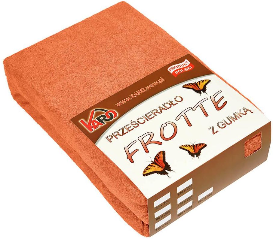 Prześcieradło frotte z gumką 90x200 rude terra 025 grube 200g/m2 KARO jest miękkie i przyjemne w dotyku, a spanie na nim to czysta przyjemność. Szeroka gama kolorystyczna pozwoli na dopasowanie koloru prześcieradła do każdej pościeli. Z kolei wysoka jakość zastosowanych materiałów sprawi, że długo będziesz cieszyć się wyborem prześcieradła KARO. Prześcieradło zachowuje swój fason i utrzymuje intensywny kolor nawet po wielu praniach. Rozmiar: 90x200 cm. Skład tkaniny: 82% bawełna, 18% poliester. Materiał: frotte - lekko rozciągliwy i niewymagający prasowania, dzięki czemu jest wyjątkowo wygodny w użytkowaniu. Gramatura: 200 g/m2 - najgrubsze prześcieradło na polskim rynku. Zakład prześcieradła wynosi ok. 15 cm i nie jest wliczany do rozmiaru. Prześcieradło przeznaczone jest na materace o wysokości do 15 cm, a zakład liczony jest na rogu prześcieradła. Dzięki bokom z narożnymi zaszewkami, profilującymi prześcieradło do kształtu materaca oraz gumce poprowadzonej w tuneliku produkt doskonale dopasowuje się i układa na materacach o różnej grubości. Przepis konserwacji: prać w temperaturze do 40°C, nie wybielać, nie prasować, nie czyścić chemicznie, suszyć w stanie rozwieszonym. Prześcieradła frotte z gumką KARO występują w wielu rozmiarach tj. m.in.:60x120, 70x140, 80x160, 90x200, 120x200, 140x200, 160x200, 180x200, 200x220 w ponad 40 kolorach. Produkt własny naszego sklepu, wyprodukowany w Polsce.