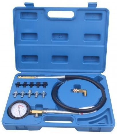 Miernik ciśnienia oleju Zawartość zestawu: Manometr o zakresie 0-10 BAR z przewodem elastycznym L=1200mm 10szt. adapterów pomiarowych Adapter kolankowy z szybkozłączem