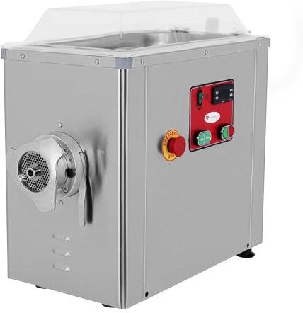 Wilk do mięsa z funkcją chłodzenia RQ.22.09-S - GP-RQ.22.09-S OPIS Opis: Profesjonalny wilk do mielenia mięsa idealnie sprawdzający się w przetwórstwie mięsnym, restauracjach, super- i hipermarketach Maszyna przeznaczona do mielenia wszystkich rodzajów mięsa bez skóry i kości Wydajność urządzenia do 400 kg na godzinę Wilk do mięsa posiada funkcję chłodzenia ze sterowaniem cyfrowym System chłodniczy pozwala na zachowanie świeżości mięsa oraz zapobieganiu rozwijania się i namnażaniu bakterii Urządzenie wyposażone w elektroniczny termostat do precyzyjnej regulacji temperatury Gardziel oraz elementy tnąco-mielące wraz z tacą załadowczą wykonane ze stali nierdzewnej Antypoślizgowe gumowe nóżki Mikroprzełącznik bezpieczeństwa Chłodzona taca załadowcza Obudowa urządzenia wykonana z wysokiej jakości stali nierdzewnej W zestawie – sitko 4 mm, nóż, ślimak, gardziel, tacka podawcza, lej załadowczy Silnik o prędkości obrotowej 1400/min., z zabezpieczeniem chroniącym przed przegrzaniem Popychacz z tworzywa ABS Przeźroczysta górna pokrywa urządzenia Łatwa w czyszczeniu konstrukcja z demontowalnym korpusem mielącym Urządzenie nie jest przystosowane do pracy ciągłej Wszystkie komponenty mające kontakt z żywnością spełniają wszystkie normy HACCP Parametry techniczne: Wymiary zewnętrzne [mm]: 560x350x630 Moc [kW]:1,5 kW Zasilanie [V]: 230 Prędkość obrotowa [obr./min]: 1400 Wydajność [kg/h]: 400 Waga [kg]: 55 Wilk do mięsa z funkcją chłodzenia RQ.22.09-S