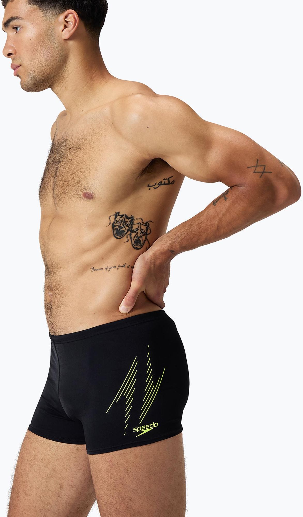 Bokserki pływackie męskie Speedo Hyper Boom Placement black/hyper yellow zaprojektowano z myślą o intensywnych treningach basenowych oraz swobodnym pływaniu rekreacyjnym. Konstrukcja tych bokserek wykorzystuje nowoczesne technologie i materiały, które gwarantują doskonałą elastyczność, szybkie schnięcie oraz perfekcyjne dopasowanie do sylwetki. Zaawansowana technologia Eco Endurance+ W modelu Speedo Hyper Boom Placement zastosowano technologię Eco Endurance+, która zapewnia wytrzymałość na działanie chloru nawet podczas bardzo częstych treningów. Materiał użyty w tej technologii chroni tkaninę przed utratą elastyczności i szybkim zużyciem, a także wspiera zachowanie optymalnej sprężystości przez długi czas użytkowania. To rozwiązanie pozwala utrzymać wysoką jakość oraz funkcjonalność produktu niezależnie od intensywności eksploatacji. Ekologiczne materiały z recyklingu Konstrukcja bokserków opiera się na wykorzystaniu poliestru z recyklingu w 53% oraz politereftalanu butylenu (PBT) w 47%, co czyni je wyborem przyjaznym środowisku. Recyklingowane przędze ograniczają zużycie surowców pierwotnych, a cała tkanina zachowuje pełnię właściwości użytkowych i trwałość. Takie podejście do doboru materiałów wpisuje się w nowoczesne standardy zrównoważonej produkcji odzieży sportowej. Konstrukcja zapewniająca swobodę ruchów Elastyczna tkanina bokserków oraz regulacja w pasie zostały zaprojektowane tak, by zapewnić pełną swobodę ruchów w wodzie. Szybkoschnący materiał pomaga utrzymać komfort termiczny zarówno podczas treningu, jak i po wyjściu z basenu. Dopracowane dopasowanie do ciała gwarantuje stabilność podczas pływania oraz zachowanie komfortu przez cały czas użytkowania. Bokserki pływackie męskie Speedo Hyper Boom Placement black/hyper yellow - cechy: Wykonane w 53% z poliestru z recyklingu i 47% z politereftalanu butylenu; Zastosowanie technologii Eco Endurance+ zwiększającej odporność na chlor; Elastyczna tkanina gwarantująca swobodę ruchów podczas pływania; Szybkoschnący materiał poprawiający komfort po treningu; Regulacja w pasie umożliwiająca precyzyjne dopasowanie; Odporność na zużycie podczas intensywnych treningów basenowych; Materiał dobrany z myślą o zrównoważonej produkcji; Dopasowanie do ciała minimalizujące opory podczas pływania; Produkt wspierający redukcję odpadów dzięki recyklingowi surowców; Wysoka funkcjonalność nawet przy częstym kontakcie z wodą basenową.