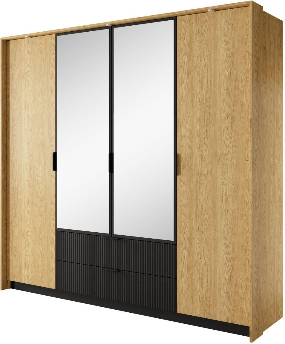 Szafa Baltic A to eleganckie połączenie naturalnego uroku drewna w kolorze dąb baltic z nowoczesnymi, czarnymi detalami. Lustrzane fronty optycznie powiększają przestrzeń, a ryflowane czarne wstawki dodają całości głębi i charakteru. To idealny wybór do sypialni, garderoby lub nowoczesnego przedpokoju.Wymiary:szer. 223,2 cm / wys. 210 cm / gł. 59 cmKorpus wykonano z płyty laminowanej E05 o grubości 16 mm, odpornej na zarysowania i wilgoć. Fronty połączono z płytą MDF 18 mm, co podnosi trwałość i nadaje meblowi elegancki wygląd. Kolorystyka dąb baltic z czarnymi akcentami wprowadza do wnętrza przytulność i nowoczesność.Szafa posiada cztery drzwi, w tym dwoje z lustrami, które dodają lekkości i funkcjonalności. W dolnej części umieszczono dwie pojemne szuflady na kulkowych prowadnicach z pełnym wysuwem i cichym domykiem – gwarantują one płynne, bezgłośne działanie i długą żywotność. Wnętrze szafy zostało zaprojektowane z myślą o wygodzie: połączenie drążka na wieszaki z licznymi półkami pozwala łatwo uporządkować garderobę.Eleganckie metalowe uchwyty w kolorze czarnym oraz obrzeża ABS zwiększają trwałość i odporność mebla na codzienne użytkowanie. Opcjonalne oświetlenie LED dodatkowo podkreśla nowoczesny charakter i ułatwia korzystanie z szafy po zmroku.Szafa Baltic A to połączenie stylu, funkcjonalności i solidnego wykonania – doskonały wybór do nowoczesnych wnętrz urządzonych z klasą.Produkt objęty jest 2-letnią gwarancją.Produkt dostarczymy do Państwa BEZPŁATNIE pod wskazany adres na terenie całego kraju.Mebel wymaga krótkiego montażu, zgodnie z załączoną instrukcją.Co WAŻNE: zgodnie z prawem i naszymregulaminemmają Państwo pełne prawo do zwrotu nieużywanych towarów, jeśli nie spełnią one Państwa oczekiwań.
