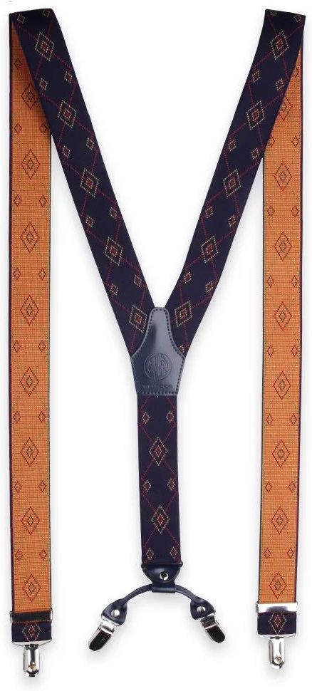 Szelki męskie Szelki męskie najwyższej jakości wykonane są z tkanej gumy galanteryjnej o szerokości 3,5 cm. Zapinki z mocowaniami i guma połączone są wysokiej jakości są skórą. Metalowe żabki poprawiają ścisk. Zapakowane w gustowne pudełko stanowią idealny prezent dla eleganckiego i stylowego mężczyzny z charakterem. Kolor szelki: granatowy w żółte i czerwone romby, strona wewnętrzna pomarańczowa Kolor skóry: granatowy Zapięcie: na żabki Szerokość szelek: 3,5 cm Długość: 80-120 cm dla typowej sylwetki Materiał: elastyczna guma galanteryjna Jakość: pierwsza Producent: Willsoor Gwarancja: 24 m-ce Wyprodukowane w Polsce