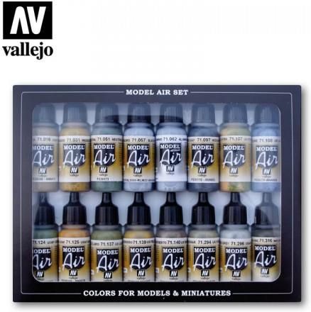 Zestaw 16 farb z serii Model Air do malowania modeli, figurek i dioram. Kolory dobrane do tematyki amerykańskiego lotnictwa. Zawiera 17 ml/0,57 fl.oz. (z zakraplaczem) butelki i wzornik kolorów. Zawartość: 71.016 USAF Olive Drab 71.031 Middlestone 71.051 Neutral Gray 71.057 Black 71.062 Aluminium 71.097 Medium Gunship Gray 71.107 US Interior Yellow 71.108 UK Azure Blue 71.124 USAF Green 71.125 USAF Brown 71.137 US Light Green 71.139 US Field Drab 71.140 US Desert Sand 71.294 US Forest Green 71.296 USAAF Light Gray 71.316 N. 41 Dark Olive Drab