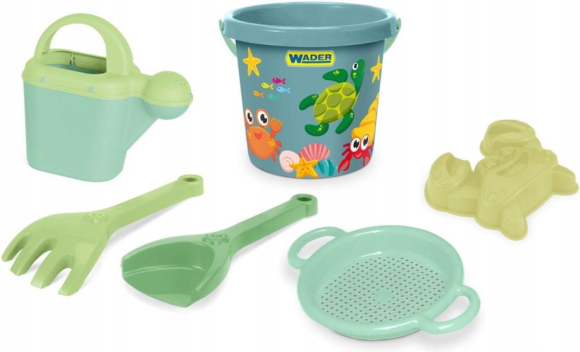 RePlay Sea World komplet do piasku 6 el. WADER 43210 Producent: WaderMateriał: 100% recykling Linia zabawek RePlay Sustainable od Wader Woźniak to nowość, która powstała z potrzeby zredukowania ilości plastiku na świecie , zmniejszenia śladu węglowego i zapewnienia naszym dzieciom lepszej przyszłości. Koncepcja produktów RePlay Sustainable opiera się na zasadzie Reuse, Recycle, Replay i oznacza, że nowa seria zabawek RePlay jest wykonana w całości z surowców pozyskanych z plastikowych odpadów konsumen­ckich, w zamkniętym procesie recyklingu z wykorzystaniem najnowszych technologii. Komplet do piasku Dino World z serii RePlay to fantastyczne letnie wyposażenie do zabawy w piasku i w wodzie dla najmłodszych . Zestaw zawiera akcesoria niezbędne do zabawy w piasku, tj.: foremkę w kształcie kraba, łopatkę, grabki, konewkę, sitko i wiaderko o ciekawej, nieścieralnej grafice z pięknym podwodnym światem zwierząt morskich, wykonaną metodą IML. Dzięki temu wytrzyma ona w stanie nienaruszonym kontakt z wodą i słońcem. Komplet do piasku daje możliwość kreatywnej zabawy dziecku, zarówno w towarzystwie, jak i bez. Zestaw pobudza wyobraźnię i twórcze myślenie. Zabawa wspiera aktywność ruchową dzieci, poprawia ich koordynację wzrokowo-ruchową i sprawność motoryczną oraz uczy współpracy w grupie. Pozwala tworzyć różne konstrukcje z piasku i aranżować scenki. zestaw zawiera 6 elementów: łopatkę, grabki, foremkę w kształcie kraba, konewkę, sitko i wiaderko o pojemności 1 l z grafiką Sea World nieścieralna, nieblaknąca grafika wykonana metodą IML zestaw umożliwia zabawę w pojedynkę oraz w grupie zabawa z wykorzystaniem kompletu do piasku Sea World z serii RePlay pobudza wyobraźnię, kreatywność i twórcze myślenie dziecka oraz jego sprawność i koordynację ruchową; pomaga w nawiązywaniu kontaktów z innymi dziećmi, uczy współpracy Produkt wykonany w całości z wysokiej jakości surowców pozyskanych z plastikowych odpadów konsumen­ckich, w zamkniętym procesie recyklingu z wykorzystaniem najnowszych technologii przeznaczone dla dzieci 1+ wymiary 19cm x 23cm x 14cm