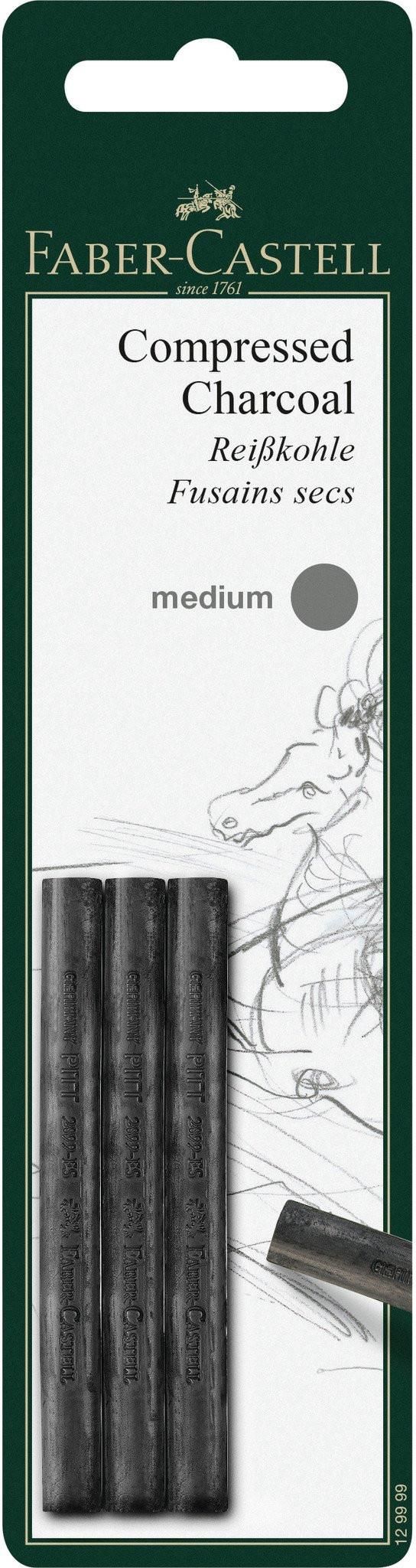 Węgiel rysunkowy - Faber-Castell - medium, 3 szt. Węgiel naturalny z serii Pitt Monochrome odznacza się najwyższą jakością. Produkt jest wytwarzany z bukowych lub wierzbowych gałęzi. Na papierze daje równomierny czarny efekt z ciekawym niebieskawym odcieniem. Grafit delikatnie przesuwa się po papierze, łatwo ściera i rozmazuje, można go wielokrotnie nakładać oraz z łatwością usunąć za pomocą gumki chlebowej. TWARDOŚĆ: średnia (medium) OPAKOWANIE: 3 szt.