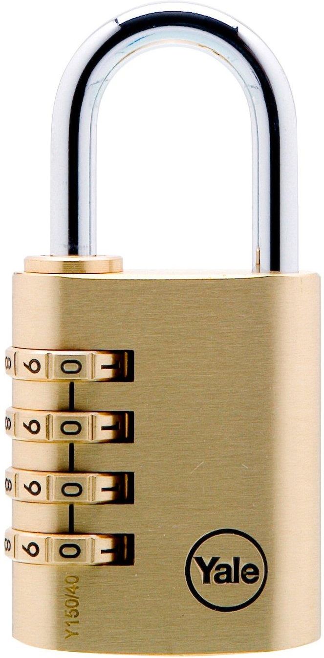 Kłódka mosiężna z zamkiem szyfrowym (na 4 cyfry) Y150/40, marki Yale. Uniwersalna pałąkowa kłódka ze zmiennym szyfrem, odporna na warunki atmosferyczne. Korpus o szerokości 40 mm wykonany jest z litego mosiądzu. Pałąk wykonany jest z hartowanej stali, pokrytej powłoką chromową. Wysoka jakość, połączona z dużą funkcjonalnością zapewniają wygodną i długotrwałą eksploatację.
