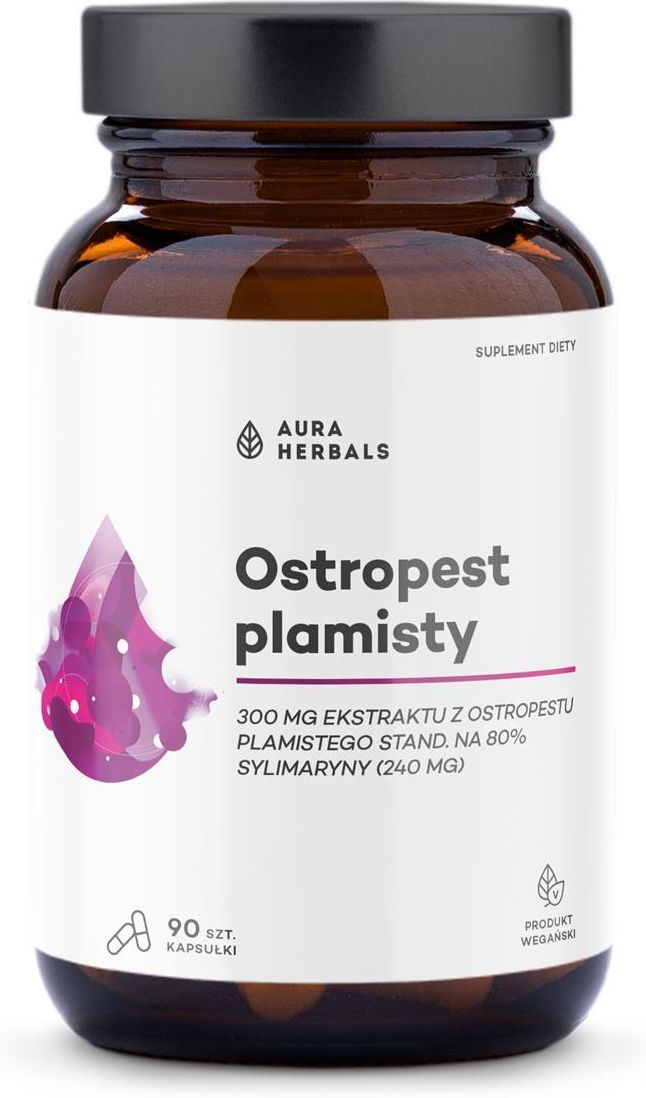 Opis Suplement diety oparty na ekstrakcie z nasion ostropestu plamistego (Silybum marianum) o stosunku DER 20:1, standaryzowanym na 80% sylimaryny. Formuła clean label – bez konserwantów, barwników i substancji zapachowych. Kapsułki Vcaps® z celulozy roślinnej barwione naturalnym koncentratem z marchwi, w pełni odpowiednie dla wegan i wegetarian. Składniki Ekstrakt z nasion ostropestu (Silybum marianum) DER 20:1 standaryzowany na 80% sylimaryny, inulina, L-leucyna, otoczka kapsułki: hydroksypropylometyloceluloza (barwnik: koncentrat marchwi). 1 kapsułka zawiera: Ekstrakt z ostropestu plamistego DER 20:1, w tym: 300 mg* 80% sylimaryny - 240 mg* L-leucyna - 10 mg* * brak Referencyjnej Wartości Spożycia Charakterystyka Sylimaryna wspiera ochronę komórek wątroby przed stresem oksydacyjnym, wspomaga naturalne procesy detoksykacji organizmu i regenerację błon komórkowych wątroby. Produkt wzmacnia też prawidłowe funkcjonowanie układu trawiennego. Stosowanie 1 kapsułka raz dziennie podczas posiłku, popić dużą ilością wody. Nie przekraczać rekomendowanej dziennej porcji do spożycia. Przeciwwskazania Nadwrażliwość na składniki preparatu. Dzieci, kobiety w ciąży i karmiące piersią (stosowanie tylko po konsultacji z lekarzem). Ostrzeżenia i środki ostrożności Nie stosować jako zamiennik zróżnicowanej diety Przechowywać w suchym miejscu, w temperaturze 15–25 °C, poza zasięgiem małych dzieci Produkt wyłącznie do użytku zewnętrznego (suplementacja) Działania niepożądane W rzadkich przypadkach możliwe łagodne dolegliwości żołądkowo-jelitowe lub reakcje alergiczne. W razie nasilenia objawów przerwać stosowanie i skonsultować się z lekarzem. Przechowywanie Przechowywać w oryginalnym, szczelnie zamkniętym opakowaniu, w suchym i zacienionym miejscu, w temperaturze 15–25 °C, z dala od dzieci. Producent Aura Herbals Sp. z o.o. ul. Grunwaldzka 49/2 80-309 Gdańsk
