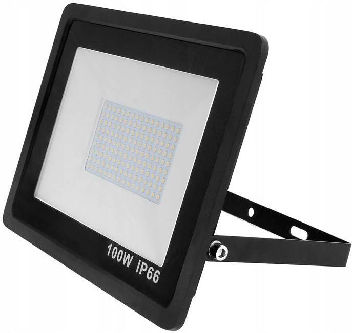 Parametry techniczne: Model: Naświetlacz LED 100w Napięcie zasilania: 230 V AC 50-60 Hz Rodzaj diody: SMD 2835 Strumień świetlny: 9000 lm Materiał: aluminium, szklany klosz Klasa szczelności: IP66 Rozmiar: 25,5 (dł) x 19,3 (szer) x 3,5 (cm) Żywotność: 30 000 godzin Kąt strumienia światła: 120° Moc wyjściowa: 100W Barwa światła: Zimna 6000K Certyfikaty: CE, RoHS