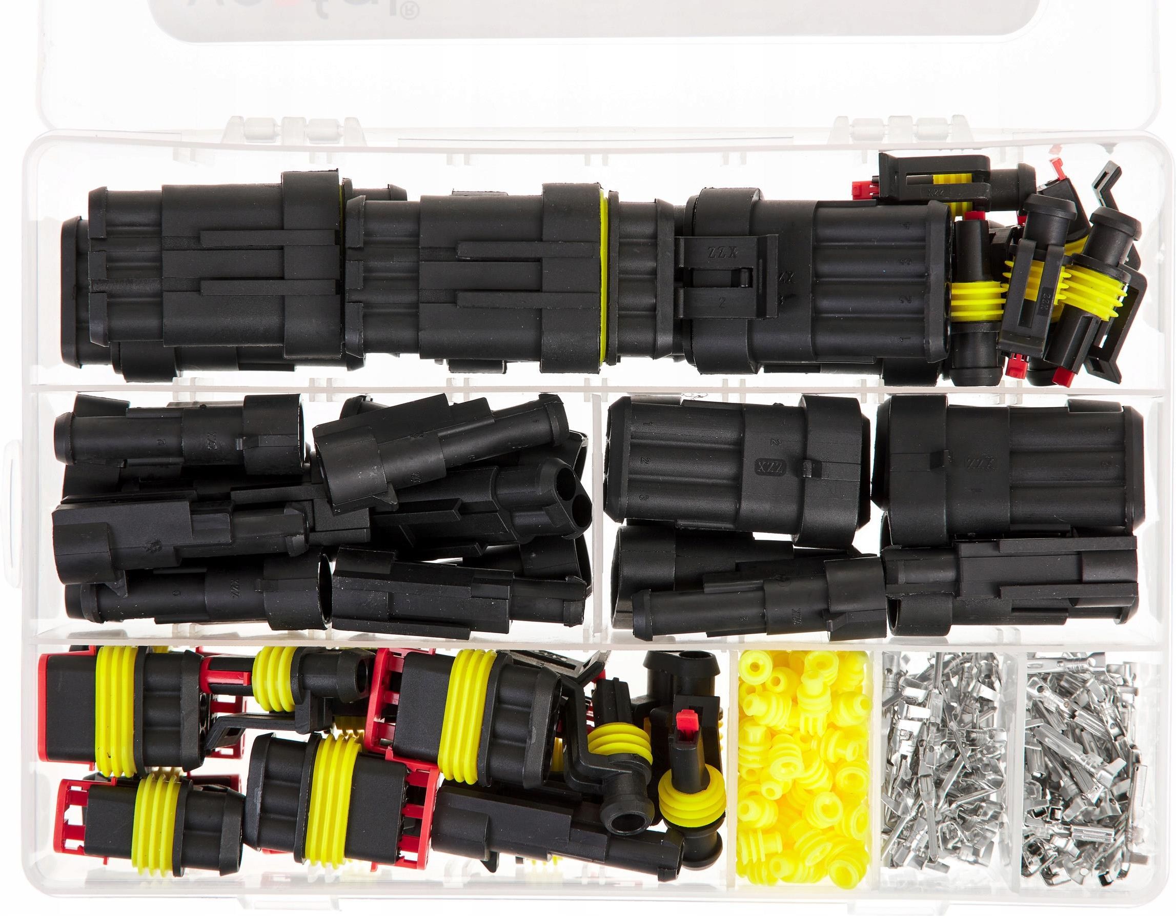 ZESTAW ZŁĄCZY ELEKTRYCZNYCH HERMETYCZNYCH 352 SZT V09108 OPIS PRODUKTU Zestaw 352 złączek hermetycznych w 6 rozmiarach pasujących do najbardziej popularnych średnic przewodów elektrycznych. Stosowane w branży motoryzacyjnej, m.in. do czujników i urządzeń w samochodach. Zapewniają bardzo dobrą izolację i szczelność. Dostępne rozmiary: 1-6-pinowe złącza typu „superserseal” wyposażone z gumowe uszczelnienia gwarantują odporność na płyny hamulcowe, oleje i paliwa opakowanie z przegródkami ROZMIARY PINÓW 1Pin: (8 zestawów) 8 x złącze obudowy, 8 x żeńskie złącze obudowy, 8 x męski pin 8 x trzpień żeński, 16 x silikonowa wodoodporna wtyczka 2Pin: (6 zestawów) 6 x męskie złącze obudowy, 6 x żeńskie złącze obudowy, 12 x męski pin, 12 x trzpień żeński, 24 x silikonowa wodoodporna wtyczka 3Pin: (6 zestawów) 6 x męskie złącze obudowy, 6 x żeńskie złącze obudowy, 18 x męski pin, 18 x trzpień żeński, 36 x silikonowa wodoodporna wtyczka 4Pin: (6 zestawów) 6 x męskie złącze obudowy, 6 x żeńskie złącze obudowy, 24 x męski pin, 24 x trzpień żeński, 48 x silikonowa wodoodporna wtyczka 22 sztuk komponentów
