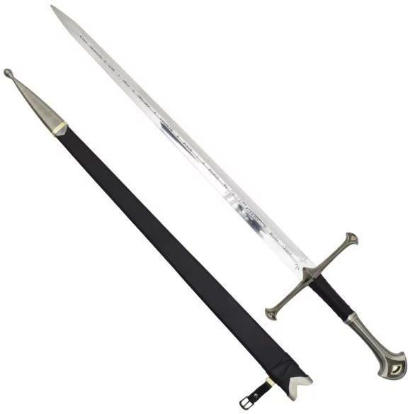 Miecz Aragorna Cinema Classic (CC-033CU) Ozdobny miecz fantasy. Ostrze z grawerunkiem. Inspirowane mieczem Aragorna z Władcy Pierścieni. Stalowe ostrze. Drewniana pochwa pokryta sztuczną skórą z metalowymi elementami. Metalowa rękojeść z częścią pokrytą sztuczną skórą. - dlugość całkowita: 119 cm (130 cm z pochwą) - długość ostrza: 90cm - WAGA 1750g (z pochwą 2450g) Nieostrzone i tępe ostrze, tylko do celów ozdobnych. Przed zakupem należy sprewdzić przepisy obowiązujące w danym kraju.