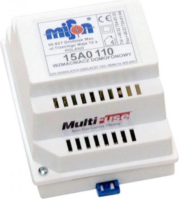 Wzmacniacz domofonowy dwu-bramowy z zasilaczem domofonowym o wyjściu ~12V. Właściwości wzmacniacza 15A0110 MIFON: Ograniczenie czasu wywołania timerem - oddzielnie dla każdej bramy (zablokowanie przycisku w kasecie jednej bramy nie powoduje blokady dzialania i obsługi drugiej bramy). Oddzielne, odporne na zwarcie wzmacniacze innym sygnałem wywołania dla każdej bramy. Przełączanie sygnałów akustycznych wyłącznie do bramy, z której nastąpiło wywołanie. Załączanie rygli układem triak-optotriak z zabezpieczeniem Multi Fuse - oddzielnie dla każdej bramy (nie powoduje zakłóceń, uszkodzenie rygla jednej bramy nie powoduje blokady działania drugiej bramy). Automatyczny priorytet wywołania bramy "1" podczas jednoczesnego wywołania z obydwu bram. Rozmowa między aparatami wewnątrz domu nie jest słyszalna w kasecie zewnętrznej.