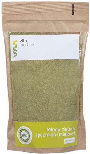 Młody jęczmień zielony VitaMedicus mielony - 150g 1 dawka: 1 łyżeczka Dawkowanie: 2-3 razy dziennie Opakowanie: 150 g Główne działanie: Preparaty witaminowo - mineralne Działanie: Wspomaga odchudzanie, usprawnia pracę jelit Dla wegetarian: Tak Dla wegan: Tak Kraj pochodzenia: Polska Młody zielony jęczmień Naturalny młody jęczmień marki VitaMedicus to wysokogotaunkowy produkt wykorzystywany w przemyśle spożywczym oraz farmaceutycznym. Głęboko ceniony za naturalną pomoc dla układu trawiennego, gdyż dzięki właściwościom przeciwzapalnym, wspomaga perystaltykę jelit oraz oczyszcza przewód pokarmowy z toksycznych produktów przemiany materii. Ta zależność pomaga usprawnić metabolizm, dzięki czemu jęczmień jest wykorzystywany przy zaparciach oraz w procesie odchudzania się. Ponadto działa kojąco na bóle głowy i migrenę oraz opóźnia procesy starzenia się komórek. Może być stosowany jako składnik sałatki bądź autonomicznie, spożywany w formie napoju. Młody jęczmień stanowi bogate źródło witamin z grupy B, antyoksydantów oraz składników mineralnych, takich jak żelazo, wapń czy magnez. Rozbudowana struktura rośliny zawiera naturalne hormony, chlorofil oraz błonnik, które wspomagają trawienie pokarmu. Z jęczmieniem zielonym od VitaMedicus możesz bezpiecznie usprawnić metabolizm swojego organizmu, jednocześnie dbając o zachowanie wszelkich wartości odżywczych potrzebnych do utrzymania równowagi pracy narządów wewnętrznych. Zalety suplementacji jęczmieniem Jęczmień wykazuje działanie przeciwzapalne i dezynfekujące Pomaga usunąć toksyny z organizmu Wzmacnia układ krążenia i pracę serca Zawiera błonnik, który przyspiesza metabolizm tłuszczu Pomaga obniżyć poziom złego cholesterolu Pobudza pracę jelit oraz reguluje procesy trawienne Pomocny przy zaparciach, wspomaga perystaltykę jelit Oczyszcza przewód pokarmowy z toksycznych produktów przemiany materii Pomaga w odchudzaniu Stosowanie i skład Stosowanie: 1 łyżeczka proszku spożywana 2-3 razy dziennie. Proszek należy wymieszać z chłodną (nie gorącą) wodą lub innym dowolnym płynem. Wypić od razu po przygotowaniu. Roztwór należy spożyć przed posiłkiem. Przechowywanie: przechowywać w suchym i ciemnym miejscu w szczelnie zamkniętym opakowaniu. Skład: 100% sproszkowany młody jęczmień. Galeria