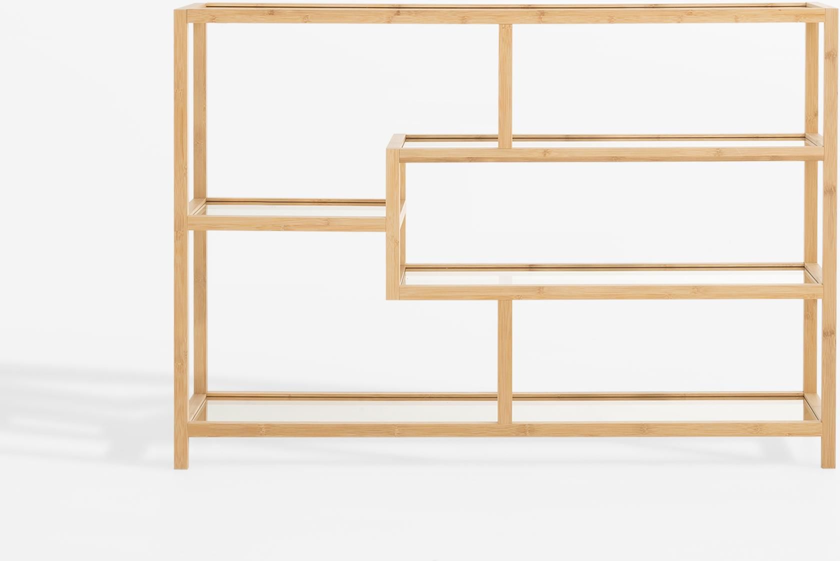 Regał HORO świetnie wpisze się w aranżacje w stylu boho lub minimalistycznym. Naturalne drewno bambusowe oraz przejrzystość szkła hartowanego sprawiają, że mebel prezentuje się lekko. Nieregularne ułożenie półek dodaje nowoczesnego charakteru. Regał współgra z jasnymi i przestronnymi wnętrzami. Regał wyposażony jest w 4 półki ze szkła hartowanego, na których ułożysz książki, doniczki z kwiatami czy płyty winylowe. Blat regału możesz przeznaczyć na ulubione dekoracje i ozdoby. Otwarta konstrukcja pozwala na łatwy dostęp do wszystkich rzeczy bez konieczności otwierania drzwiczek. Regał HORO połącz z innymi regałami z tej samej kolekcji.