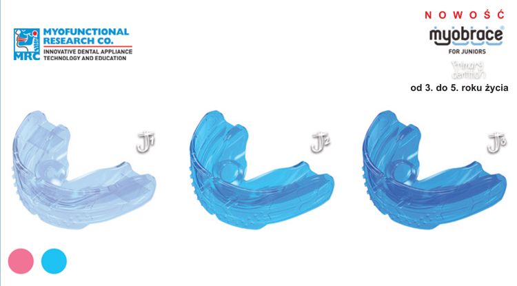Aparat J1 od 3 do 5 roku życia. Budowa wydłużony zderzak wargowy dopracowana zakładka językowa zapora językowa element resorujący kanał na zęby otwory zapewniające dopływ powietrza rynienka wargowa Aparaty Myobrace for Juniors to trzyetapowy system opracowany z myślą o korygowaniu złych nawyków czynnościowych i dysfunkcji narządu żucia oraz jednoczesnym leczeniu nieprawidłowego rozwoju szczęki i żuchwy. Zostały opracowane z myślą o: wyrabianiu prawidłowego nawyku żucia, uczeniu prawidłowego oddychania przez nos, korygowaniu pozycji języka, odzwyczajeniu od ssania smoczka lub palca, stymulowaniu rozwoju łuków zębowych. Faza I – aparat J1 Aparat J1 służy do korygowania złych nawyków. Jest zrobiony z elastycznego silikonu, aby łatwo dopasować się do każdego typu łuku i każdej wady zgryzu. Został wyposażony w przednie i tylne elementy resorujące, aby poprawić funkcjonowanie mięśni u dzieci z uzębieniem mlecznym. Występuje w jednym rozmiarze, w wariantach niebieskim i różowym. Faza II – aparat J2 Aparat J2 zapewnia prawidłowy rozwój łuku oraz korygowanie złych nawyków. Wykonano go z materiału o średniej twardości, sprzyjającemu rozwojowi i poszerzaniu szczęki i żuchwy. Występuje w jednym rozmiarze, w wariantach niebieskim i różowym. Faza III – aparat J3 Aparat J3 umożliwia dalszy prawidłowy rozwój szczęki i żuchwy i korygowanie wad zgryzu. Aparat J3 zapewnia doskonałe uszeregowanie zębów, a szersza zakładka językowa zatrzymuje język na właściwej pozycji. Aparat występuje w jednym rozmiarze, w wariantach niebieskim lub różowym. Stosowanie aparatów Myobrace for Juniors jest najskuteczniejsze u dzieci w fazie uzębienia mlecznego, już od 3 roku życia.