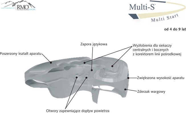 Budowa zderzak wargowy wyżłobienia na siekacze centralne i boczne z korektorem linii pośrodkowej zapora językowa otwory zapewniające dopływ powietrza poszerzony kształt wyższe ścianki aparatu – sterowane wyrzynanie zębów, odblokowanie uzębienia i stymulowanie wzrostu żuchwy Aparat Multi-Start został zaprojektowany dla dzieci w wieku od 4. do 9. roku życia z uzębieniem mlecznym i mieszanym. Należy do grupy aparatów miękkich, które są dobrze tolerowane przez pacjentów, co przyczynia się do dobrej współpracy z ich strony. Działanie aparatu Poszerzona przednia część aparatu bezpośrednio wpływa na zmianę kształtu łuku zębowego. Kształt aparatu wymusza prawidłowe układanie języka. Wyższe ścianki między trzonowcami i wyżłobienia po wewnętrznej stronie aparatu wspomagają sterowane wyrzynanie zębów, odblokowują uzębienie i stymulują wzrost żuchwy. Wyżłobienia na siekacze centralne i boczne wraz z korektorem linii pośrodkowej zapewniają ustawienie siekaczy w zgryzie prostym już we wczesnym wieku. Zderzak wargowy redukuje siły pochodzące z warg. Noszenie aparatu zapewnia prawidłową relację przednio-tylną. Aparat Multi-S może być sterylizowany w temperaturze 134 C. Występuje w jednym rozmiarze, ale dzięki giętkości tworzywa z którego go wykonano, można go łatwo dopasować za pomocą nożyczek. Aparat Multi-S musi być noszony przynajmniej 4 godziny w ciągu