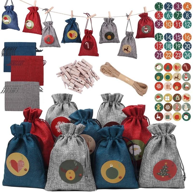 KALENDARZ ADWENTOWY - WORECZKI + KLAMERKI + NAKLEJKI - DIY ZESTAW XXL Kalendarz adwentowy do uzupełnienia dla dzieci24 worki jutowe w trzech kolorachNiepowtarzalny element do Twojej tradycji rodzinnego AdwentuWoreczki adwentowe DIY do wypełnienia własnymi pomysłami na prezentAkcesoria do …
