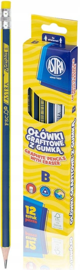 Astra ołówek szkolny z gumką B 12 sztuk Astra ołówek z gumką BProducent: Astra SAASTRA S.A. to czołowa polska marka, która wyróżnia się długoletnią obecnością na rynku polskim oraz wysoką jakością produktów. Dzięki starannie prowadzonym badaniom produkty te spełniają najbardziej rygorystyczne wymogi bezpieczeństwa. Postaw na jakość i bezpieczeństwo! Opis produktu:ołówki grafitowez gumką B