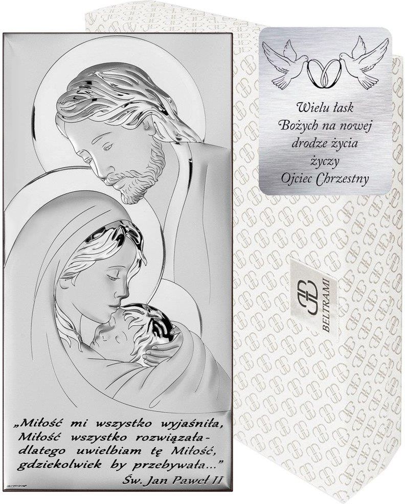 Obraz srebrny Święta Rodzina z cytatem Jana Pawła II o miłości. Obrazek srebrny Święta Rodzina to obraz zjednoczenia (komunii) Świętych Osób. Jednocześnie obraz ten wyraża zjednoczenie, miłość, życie małżeństwa i rodziny chrześcijańskiej, która dąży do świętości i do tworzenia komunii we własnym małżeństwie i rodzinie, dzięki czemu jest to doskonały prezent na ślub czy narodziny dziecka. Obrazek wyprodukowany został przez firmę Beltrami. Gwarantuje ona, iż przedmiot nabyty przez Państwa został wyprodukowany we Włoszech, zgodnie z kunsztem i tradycją obróbki metali szlachetnych. Do produkcji wykorzystano innowacyjny metal szlachetny o nazwie MIRO-SILVER, opatentowany na terytorium całej Europy. Jest to nowoczesny surowiec pokryty w procesie atomowym warstwą czystego srebra 999,95. Otrzymany drogocenny metal posiada wyjątkowe cechy, przewyższając jakością materiały pozyskiwane metodami tradycyjnymi. Jest odporniejszy na odkształcenia mechaniczne i śniedzenie, doskonale odbija światło, co podkreśla szlachetność srebra. Obrazek zabezpieczony jest warstwą lakieru, która chroni przed czynnikami zewnętrznymi. Wpływa to na bezproblemowe użytkowanie bez potrzeby częstego czyszczenia. Obrazek ma możliwość zarówno powieszenia, jak i postawienia dzięki dołączonej, wsuwanej stopce.