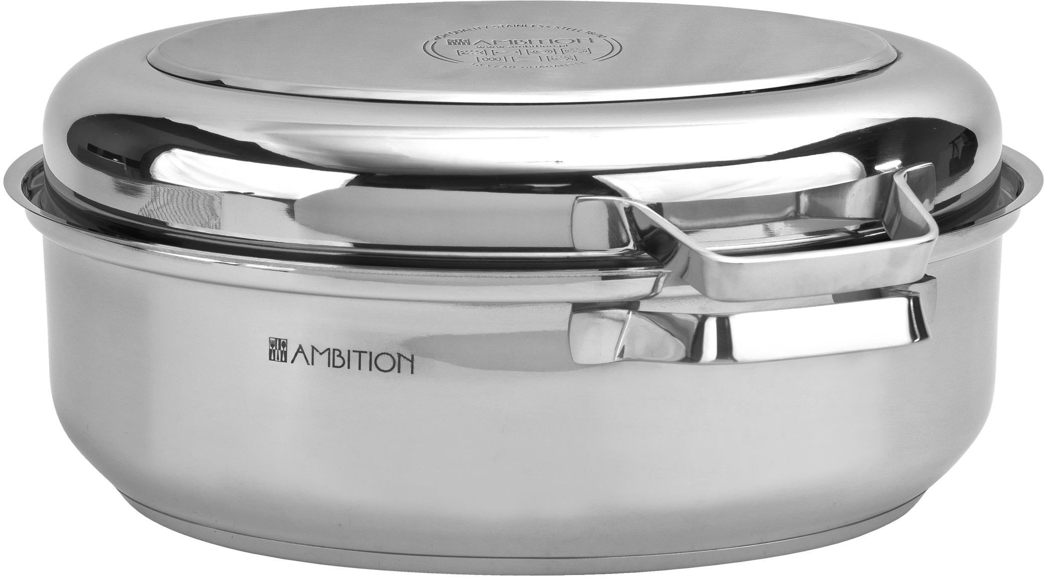 Wysokiej jakości brytfanna z rusztemExpert wykonana ze stali nierdzewnej 18/10. Jej owalny kształt zwiększa funkcjonalność i użytkowanie. Brytfanna przystosowana jest do wszystkich typów kuchenek, w tym indukcyjnych. Spokojnie można stosować ją w piekarniku. Wytrzymuje temperaturę do 180 °C. Brytfanna Ambition posiada podwójną funkcjonalność. Można używać dolnej oraz górnej części osobno, jako dwa niezależne naczynia do pieczenia. Posiada także wyjmowany ruszt, który umożliwia pieczenie bez zbędnego tłuszczu.Grubość ścianek naczyń wynosi 0,6 mm, co umożliwia dłuższe utrzymywanie ciepła. Naczynia Expert wyposażone są w trójwarstwowe dno (stal – aluminium – stal), co pozwala na równomierne rozchodzenie się skumulowanego ciepła podczas podgrzewania. Specyfikacja produktu Pojemność użytkowa: 5,5 L Średnica pola grzewczego: 29,5 x 18 cm Wysokość całkowita, po złożeniu: 17 cm Wymiary rusztu: 27,2 x 17 cm Wymiary podstawy: górne: dł.37 x szer. 26 cm, szerokość z uchwytami: 36 cm, wysokość: 12,3 cm Wymiary pokrywy: górne: dł. 35,5 x szer. 24,3 cm, szerokość z uchwytami: 36 cm, wysokość: 6 cm