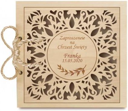 Deku - Ażurowe Zaproszenie na Chrzest Święty - Wzór 1 Ażurowa, drewniana pamiątka to nowoczesny i innowacyjny pomysł na prezent lub na zaproszenie gości na ważną uroczystość. Wygląda niezwykle elegancko i stylowo. grawerunek wykonujemy pod indywidualne zamówienie. Może to być pamiątka Chrztu …