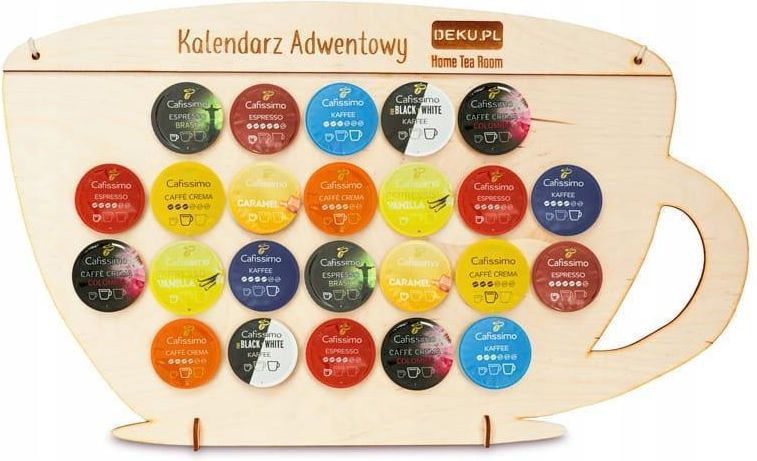 Deku - Kalendarz adwentowy 2w1 Tchibo Cafissimo 24 kapsułki 50x30cm Uwielbiasz Świąteczny nastrój w swoim domu? Odliczaj czas do świątecznych dni przy pomocy aromatycznego kalendarza adwentowego Tchibo Cafissimo i schowaj ulubiony smak kawy w każdym okienku uroczej filiżanki. Odliczanie dni, za pomocą kalendarza adwentowego, to w wielu domach tradycyjna część grudniowego oczekiwania na Wigilię. Kalendarz adwentowy, w formie drewnianej podstawki na pyszną kawę, który posiada 24 okienka. Świetnie sprawdzi się jako ozdoba Świąteczna w Twoim domu, podczas oczekiwania na Święta, a potem - dzięki zdejmowanej części z grawerunkiem, może Ci służyć przez cały rok! Kalendarz można również powiesić na ścianie. Wygląda niesamowicie estetycznie i jest wygodny w użytkowaniu dzięki umiejscowieniu w odpowiedniej odległości od ściany. Stylowa i niezwykle wygodna podstawka do eksponowania kapsułek z kawą w formie filiżanki. Przeznaczona zarówno do dekoracji wnętrz, do tradycyjnego odliczania dni do Wigilii, oraz do przechowywania kapsułek do parzenia kawy. Wygrawerowany napis możemy wymienić na inny, lub możesz go całkiem ściągnąć po skończeniu kalendarza. Możemy wygrawerować twój ulubiony cytat, ulubione słowo lub dedykację. Nadaje Świąteczny, aromatyczny klimat Jest wypełniony 24 kapsułkami z pyszną kawą w 12 smakach Oryginalny kalendarz adwentowy dla prawdziwego smakosza z pysznymi smakami aromatycznej kawy na każdy dzień 2w1 Stojący lub wiszący Kalendarz przeznaczony jest do samodzielnego złożenia, a elementów nie trzeba sklejać! Wystarczy założyć nóżki i gotowe! Specjalnie zaprojektowane otwory i system mocowania umożliwiają szybkie złożenie. Design: Piękna ozdoba na blat, stół czy półkę. Umili oczekiwanie na cudowny czas Świąt Bożego Narodzenia i zapewni codzienną radość aromatyczną i pyszną kawą. W zestawie dostępne różne smaki, które występują po kilka sztuk jednego smaku. Smaki wysyłamy losowo. Specyfikacja: wymiary - szerokość: 50 cm / wysokość: 30 cm grubość materiału 3 mm materiał: sklejka brzozowa kolor: naturalne niemalowane drewno 24 kieszonki z kapsułkami Tchibo Cafissimo Z grawerunkiem 2w1 stojący lub wiszący Zdejmowane nóżki Kalendarze zawsze są starannie zapakowane i zabezpieczone, by nie uległy zniszczeniu podczas transportu.