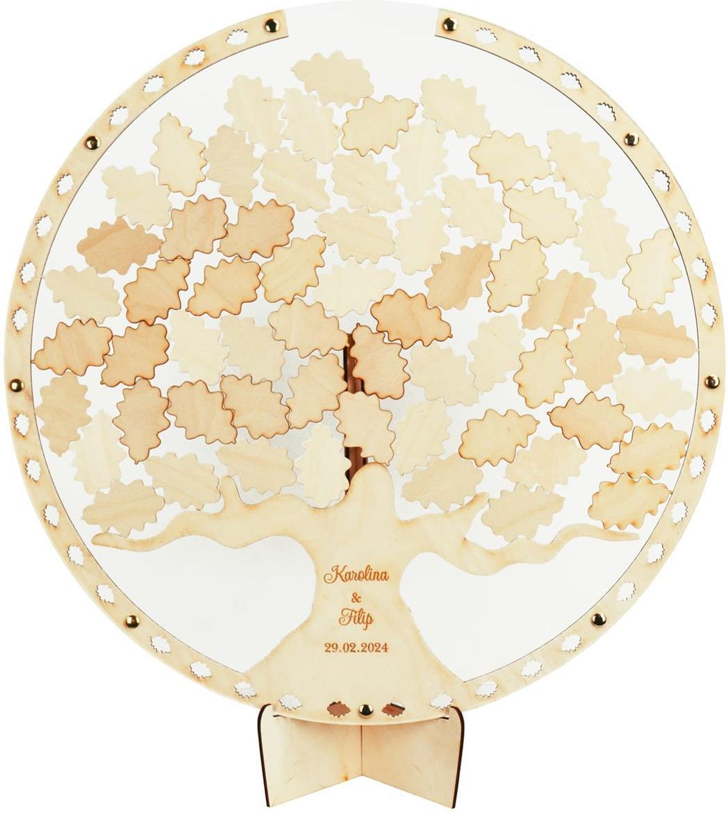 Deku – Księga gości weselnych Okrągła Ramka z listkami– 52x52 cm Księga gości w formie okrągłej ramki z Drzewem w środku, to modna i nowoczesna pamiątka od gości weselnych dla Pary Młodej. Ramka wykonana jest z wytrzymałej i jakościowej sklejki brzozowej, wykończona szybkami z 3 mm grubości, przezroczystej pleksi. Skręcona jest metalowymi nitami co w razie potrzeby umożliwia późniejsze jej rozkręcanie i skręcanie. W zestawie znajduje się 62 szt. drewnianych listków, na których goście zostawią przeróżne napisy, które po latach przypominają o wspaniałych i szczęśliwych chwilach. Na pniu znajduje się grawerunek z imionami Pary Młodej, datą ślubu lub dowolnym napisem. Po wrzuceniu wszystkich listków w ramce tworzy się pięknie drzewo. Ramka prezentuje się doskonale na dołączonej podstawce. Całość sprawi wiele radości zarówno Młodej Parze jak i gościom weselnym. Ramka jest idealną dekoracją na stół, podczas przyjęcia weselnego. Księga gości w formie ramki to fantastyczny pomysł na ślub, dzięki któremu sprawicie sobie niesamowitą i nowoczesną pamiątkę. Ramkę można rozkręcić i wyczyścić w środku gdyby się zakurzyła przez otwór lub też ułożyć listki w dowolny sposób. W zestawie z ramką załączone jest pudełeczko do przechowywania listków przed ich wrzuceniem do ramki. Specyfikacja Wymiary: Rama w rozmiarze 52x52 cm, Listki: 62 szt. drewnianych listków na wpisy o wymiarze 6x4 cm Grubość ramki: 10 mm Ramka posiada z obu stron przezroczystą pleksi, dzięki której listki nie wypadają poza ramkę oraz wykonany otwór u góry, przez który można wrzucać listki do środka oraz wyjmować je. Całość wykonana jest bardzo solidnie, z dbałością o każdy szczegół! Grawerunek zawiera się w cenie ramki. Ramka jest rozbieralna co ułatwia czyszczenie lub wymianę listków.
