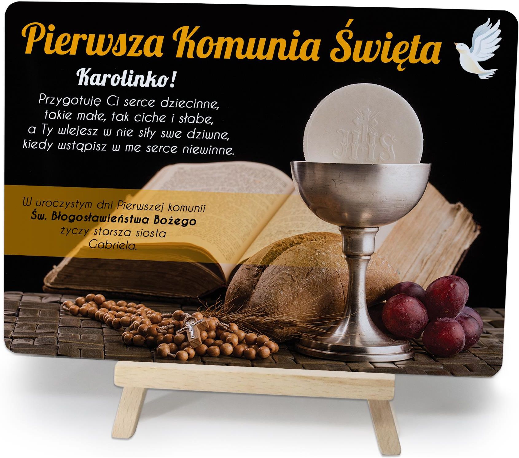 Personalizowana Pamiątka I Komunii Świętej na drewnianej sztaludze Dane techniczne: Rozmiar: 14x10 lub 20x14 cm + wysokość sztalugi Kształt: Prostokąt Grubość: 3mm, Materiał: metal, papier, drewno (sztaluga) Nadruk: pełnokolorowy, niewyczuwalny w dotyku Wyjątkowej urody pamiątka I Komunii Świętej …