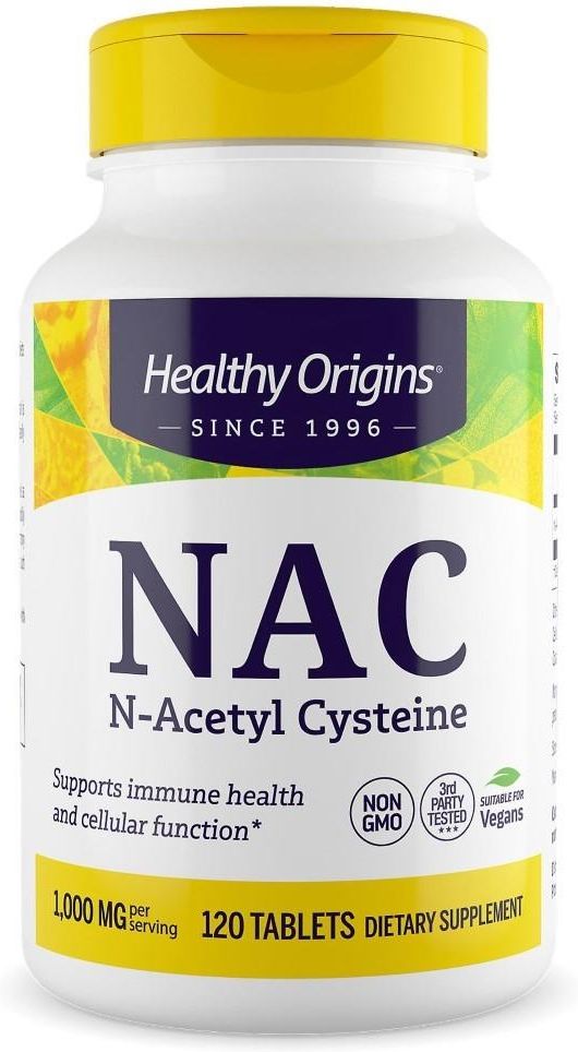 Healthy Origins NAC to suplement diety w tabletkach, zawierający N-acetylocysteinę. Skład: Wielkość opakowania: 120 tabletek Porcja jednorazowa: 2 tabletki Ilość porcji w opakowaniu: 60 Składniki2 tabletkiRWSNAC (N-acetylocysteina)1000 mg RWS - Dzienna referencyjna wartość spożycia Nie ustalono dziennej referencyjnej wartości spożycia Składniki: NAC (N-acetylocysteina), substancja wypełniająca: celuloza mikrokrystaliczna, kwas stearynowy, otoczka roślinna, substancje przeciwzbrylające: stearynian magnezu, dwutlenek krzemu, kroskarmeloza sodowa, fosforan dwuwapniowy. Sposób użycia: Jako suplement diety dla dorosłych: 2 tabletki dziennie lub zgodnie z zaleceniem pracownika służby zdrowia. Przeciwwskazania: Nadwrażliwość na którykolwiek ze składników preparatu. W okresie ciąży i karmienia piersią przed zastosowaniem należy skonsultować się z lekarzem lub farmaceutą. Przechowywanie: W miejscu niedostępnym dla małych dzieci. Przechowywać w suchym miejscu, unikać nadmiernego ciepła. Nie używać, jeśli uszczelka pod korkiem jest uszkodzona lub jej brakuje.