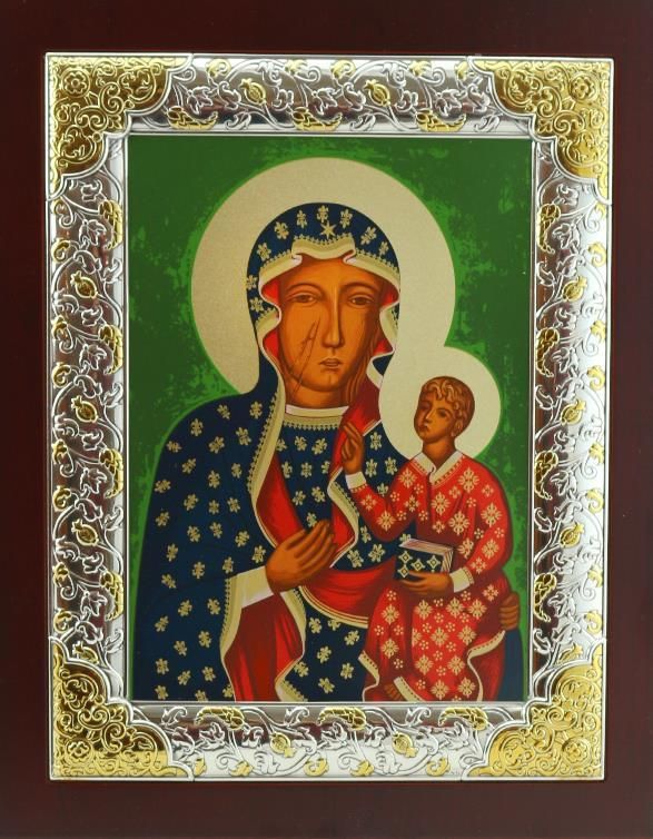 Ikona Matki Bożej Częstochowskiej z posrebrzaną ramką, osadzona w lakierowanej drewnianej ramie. Zewnętrzna warstwa srebra pokryta jest zabezpieczającym lakierem, dzięki któremu produkt na długo zachowa swój blask. Ikonę można zawiesić lub postawić dzięki dołączonej do zestawu nóżce. Idealnie nadaje się na prezent z okazji jubileuszu, urodzin, imienin, ślubu oraz wielu innych uroczystości. Ikona posiada stosowny certyfikat.