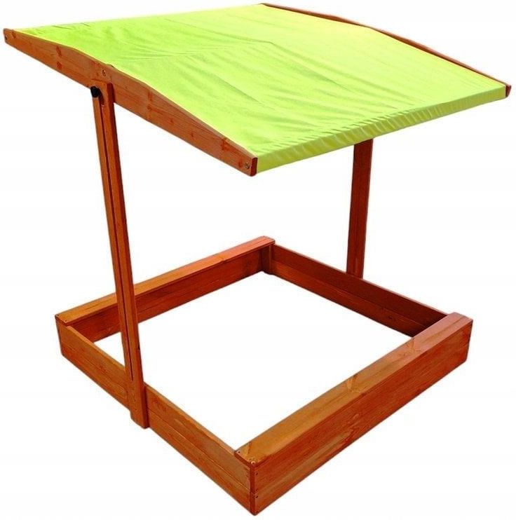 Drewniana piaskownica z daszkiem chroniącym dziecko przed słońcem, który można po zakończonej zabawie można opuścić, aby chronił piasek przed zwierzętami, liśćmi itp. Piaskownica wykonana jest z drewna świerkowego lub sosnowego, impregnowana ekologicznym impregnatem wodnym. Daszek pokryty jest wytrzymałą tkaniną poliestrową. Daszek jest regulowany- zarówno jego wysokość jak i pochylenie. Dno z agrowłókniny zapobiega wymieszaniu piasku z podłożem oraz wyrastaniu trawy jednocześnie w naturalny sposób przepuszczając wodę i powietrze. Piaskownica wysyłana jest w zestawie do samodzielnego montażu. W zestawie znajdują się wszystkie śruby i wkręty oraz instrukcja składania. Wymiar piaskownicy - ok. 120 cm x 120 cm - wysokość ok. 20 cm - grubość desek ok. 2 cm Piaskownica jest doskonałym miejscem zabaw dla dzieci, oraz stanowi wspaniałą ozdobę ogrodu.
