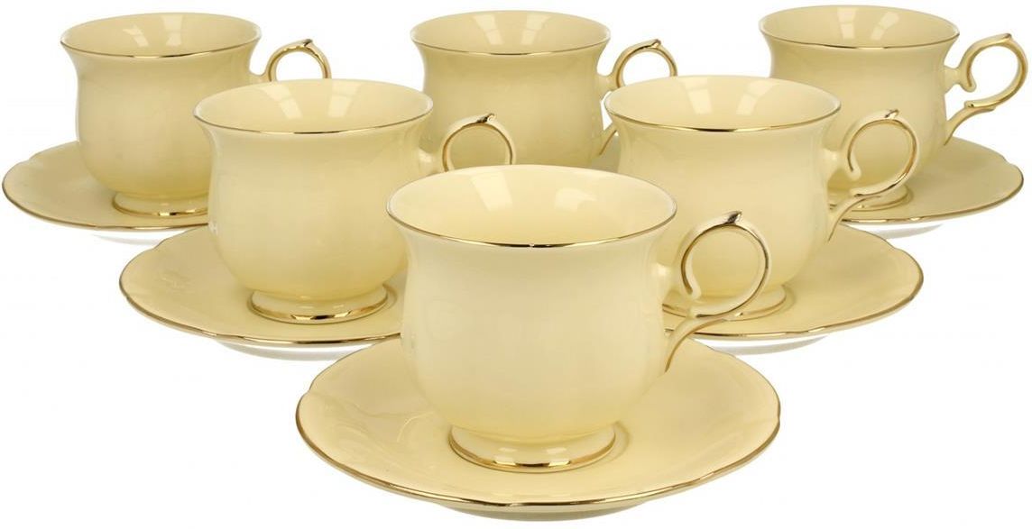 Ekskluzywny komplet 6 filiżanek w kształcie baryłki ze spodkami Clark wchodząca w skład kolekcji Ecru. Wykonany z najwyższej jakości porcelany w kolorze śmietankowym wykończonej złotymi zdobieniami. Pojemność filiżanki 260 ml (pojemność liczona po rant filiżanki). Klasyczna stylistyka zadowoli najbardziej wymagające gusta. Całość zapakowana w ozdobne pudełko to doskonały pomysł na niebanalny prezent urodzinowy zarówno dla kobiety i mężczyzny, a także podarunek dla szefa czy nauczyciela, również jako podziękowanie. Zestaw idealnie sprawdzi się na uroczystości rodzinne czy na przyjacielskie "ploteczki" przy kawie z ciasteczkiem. Wzór: Clark Produkt 6 x filiżanka 6 x spodek 1 x prezentowe pudełko Wymiary wysokość filiżanki 7,8 cm średnica filiżanki 8,7 cm średnica spodka 15,2 cm pojemność całkowita filiżanki 260 ml pojemność użytkowa filiżanki około 230 ml Materiał porcelana Użytkowanie dopuszczone do kontaktu z żywnością