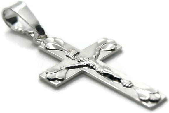 Krzyż srebrny z wizerunkiem Jezusem ma typową formę krzyża, z pionową belką krótszą od poziomej, tworzącą kształt litery "T".Krzyżyk wykonany ze srebra próby 925. Waga: 2,0 g Metal: Srebro Ag 0,925