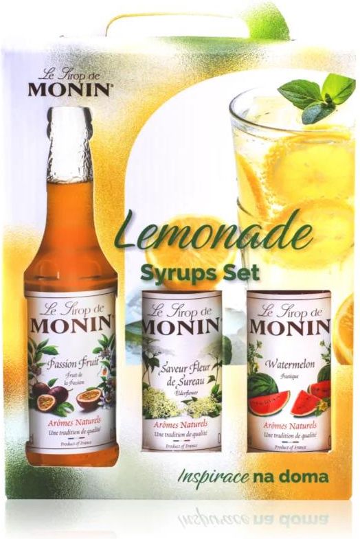 Monin Lemonade Passion fruit, Watermelon, Elderberry, , Dodatki smakowe do wody dla mężczyzn, Właściwości: orzeźwiający smak łatwe i szybkie przygotowanie doskonały wybór w ramach urozmaicania codziennej podaży płynów Zawartość zestawu: Monin Le Sirop Marakuja syrop do przygotowania napoju 250 ml Monin Le Sirop Bezinka syrop do przygotowania napoju 250 ml Monin Le Sirop Meloun vodní syrop do przygotowania napoju 250 ml