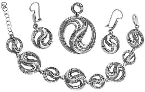 Piękny Srebrny Oksydowany Komplet z Cyrkoniami Wyrób Naprawdę Efektowny,Stylowy !!! Próba 925 Waga - Wisiorek ~ 6,8 g. Kolczyki ~ 5,5 g. Bransoletka ~ 14,5 g. Długość - Wisiorek - 4,6 cm. Kolczyki 4,4 cm. na angielskim zapięciu Bransoletka 17 cm. z przedł. do 20,5 cm. Szerokość - Wisiorek 3,4 cm. Kolczyki 1,9 cm. Bransoletka 2 cm. KUPUJĄC U MNIE BIŻUTERIĘ OTRZYMUJĄ PAŃSTWO !!! Biżuterię Przebadaną i Podbitą przez Urząd Probierczy ! Dowód zakupu (paragon/faktura Vat ) ! Ubezpieczenie przesyłki ! Metkę jubilerską ! Gwarancję 12 miesięcy ! Odpowiednio Dopasowane do Wyrobu Pudełeczko Jubilerskie Możliwość zwrotu lub wymiany w ciągu 14 dni Towar ten jest nowy nigdy nie używany Zapraszam serdecznie !!!