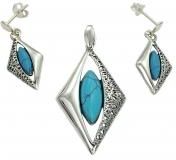 Piękny Srebrny Oksydowany Komplet z Turkusem !!! Wspaniała Jakość i Atrakcyjność Wyrobu w Stosunku do Ceny. Próba 925 Waga - Wisiorek 5,8 g. Kolczyki (sztyft lub wiszące) 4,5 g. Długość - Wisiorek 4,9 cm. Kolczyki 3,6 cm na sztyft, wiszące lub zap. angielskie 2,4 cm. Szerokość - Wisiorek 2,5 cm. …