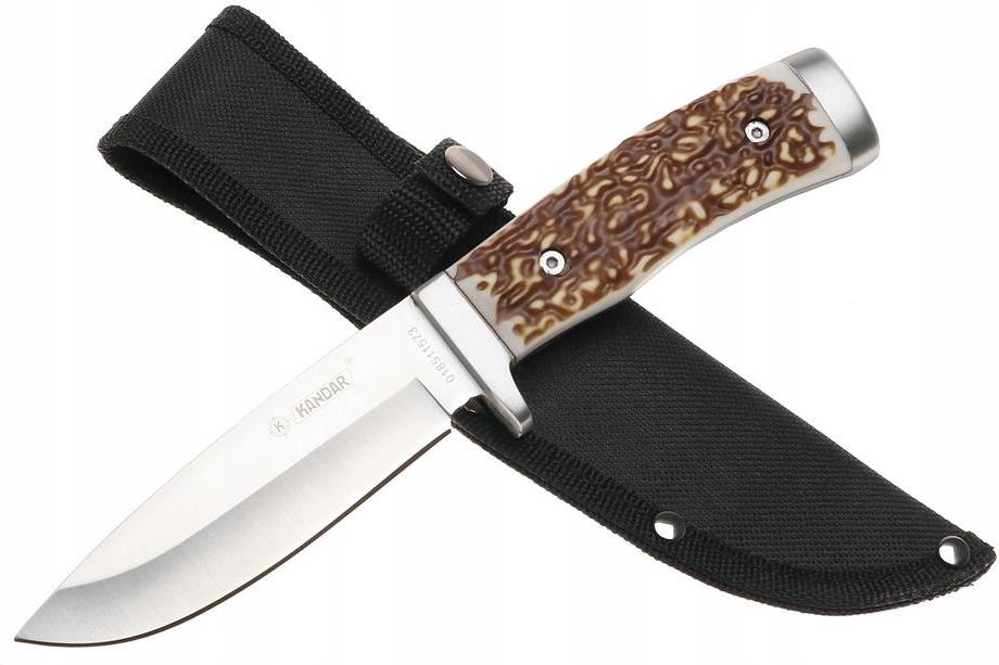 Nóż myśliwski z pokrowcem Głownia typu Drop point utwardza sztych dzięki czemu nóż bardzo dobrze tnie. Idealny nóż myśliwski, ale również roboczy Cechy produktu: Nóż wykonany z wysokiej jakości grubej stali Bardzo ostry Wygodnie leży w dłoni Głownia typu Drop point Rękojeść typu full tang (pełny trzpień) Uchwyt z nakładek na wzór kości montowany na dwa piny Jelec chroni przed ześlizgnięciem się dłoni Stalowa głowica Bardzo solidne wykonanie Długość ostrza: 10 cm Długość noża: 22,5 cm W zestawie materiałowy pokrowiec
