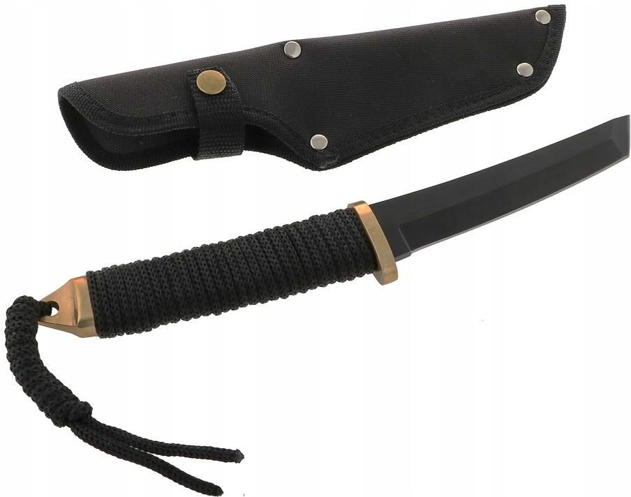 Nóż tanto + kabura Potężny, ostry sztych może powodować poważne rany, przez co tanto najczęściej spotyka się w nożach o przeznaczeniu bojowym Cechy produktu: Nóż wykonany z wysokiej jakości stali Bardzo ostry Wygodnie leży w dłoni Nóż typu tanto Konstrukcja z pełnym ukrytym trzpieniem Rękojeść ze splotu linki Na dole rękojeści głowica z otworem na linkę Bardzo solidne wykonanie Długość ostrza: 13 cm Długość noża: 28 cm W zestawie materiałowy pokrowiec