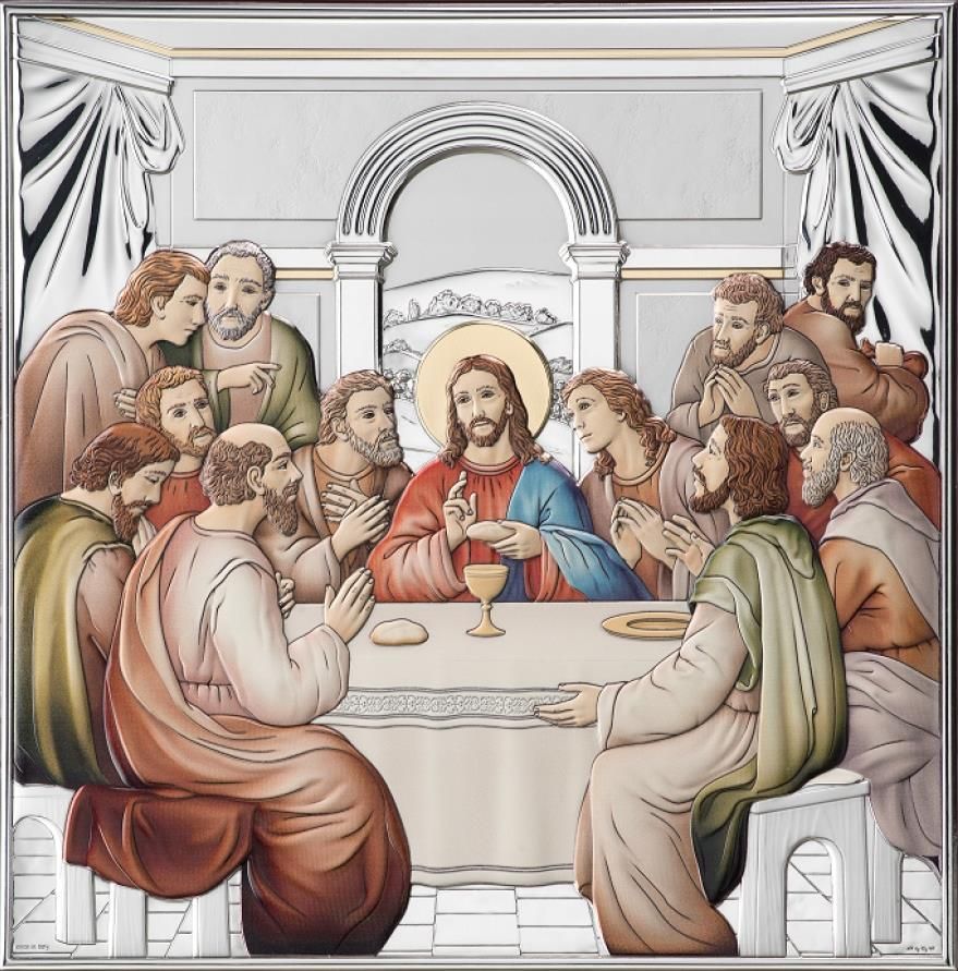 Ostatnia Wieczerza kolorowy GF0441/3DC obrazek Obrazek srebrny przedstawiający wizerunek Ostatniej Wieczerzy Wykonany z blachy dwuwarstwowej aluminium i srebra. Zewnętrzna warstwa srebra pokryta jest zabezpieczającym lakierem, dzięki któremu produkt zachowuje blask. Prezentowany produkt jest …