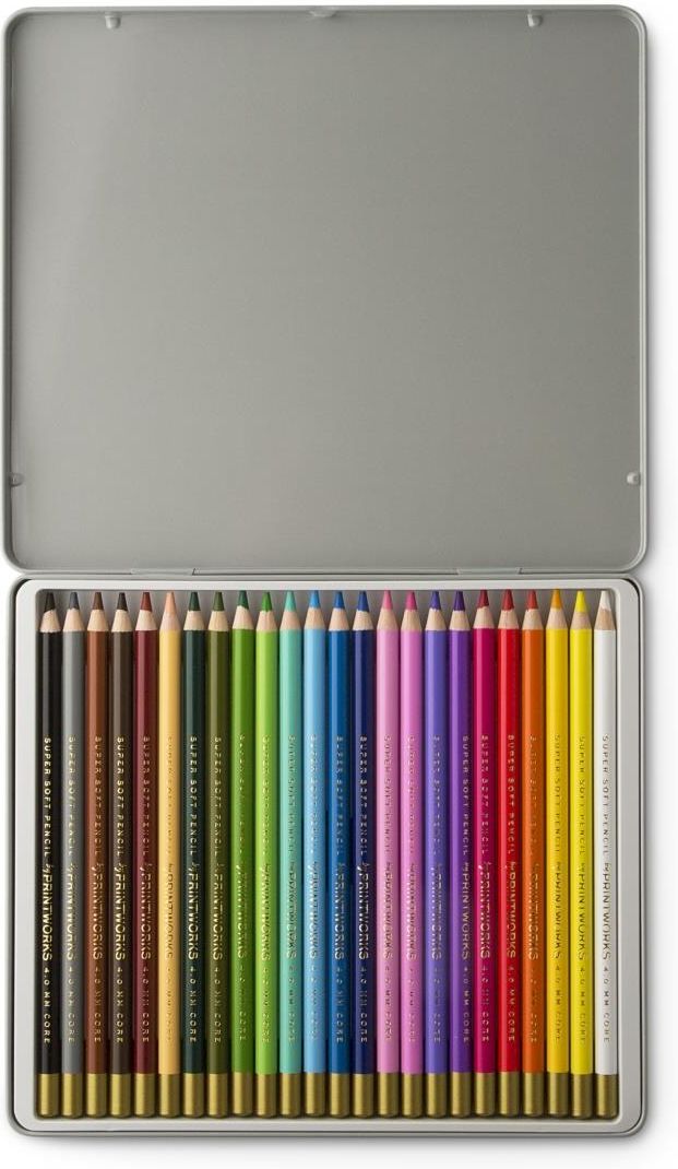 Zestaw kredek 24 Kolorów. Classic Zestaw 24 starannie dobranych kredek klasycznych kolorach i estetycznym metalowym opakowaniu. Zaprojektowane i wyprodukowane przez PRINTWORKS. Dla wszystkich entuzjastów kolorowania i artystów wykonujących własne prace. Dzięki ich miękkim, bardzo grubym rdzeniom …