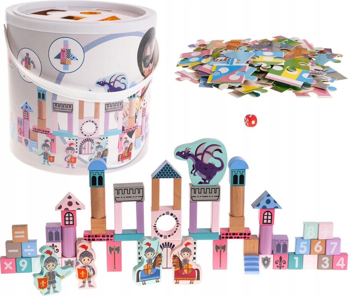Drewniany Zamek Z Rycerzami OpisDrewniany Zamek z Rycerzami Zestaw malowanych drewnianych, bezpiecznych klocków, z których zbudować można zamek z rycerzami, to propozycja dla dzieci już od 3-go roku życia. Zestaw składa się z 66 elementów: klocków, puzzli, woreczka na klocki oraz pudełka z sorterem kształtów na górze. Doskonała nauka kształtów, figur geometrycznych oraz zabawa pobudzająca wyobraźnię i logiczne myślenie. Puzzle są dwustronne, z jednej strony widnieje obrazek z zamkiem, smokiem i rycerzami a z drugiej strony znajduje się gra. Wymiary - klocki kwadratowe ok. 3 cm x 3 cm x 3 cm, - klocki kwadratowe mniejsze ok. 3 cm x 3 cm x 1,5 cm, - duży klocek kwadratowy ok. 6 cm x 6 cm x 1,5 cm, - klocki prostokątne ok. 6 cm x 3 cm x 1,5 cm, - klocki prostokątne większe ok. 6 cm x 3 cm x 3 cm, - klocki o kształcie walca ok. 6 cm x 3 cm, - klocki trójkątne ok. 3 cm x 3 cm x 6 cm, - klocki z rycerzem ok. 9 cm wysokości, - klocki z rycerzem na koniu ok. 8,5 cm, - klocki ze smokiem ok. 10,5 cm x 9 cm x 1,5 cm, - schodki ok. 3 cm x 3 cm x 3 cm, - kostka ok. 1 cm x 1 cm, - puzzle ok. 40 cm x 40 cm, - worek na klocki ok. 30 cm x 34 cm, - opakowanie ok. 22,5 cm x 22 cm. Zawartość zestawu - klocki o różnych kolorach, kształtach, - klocki ze smokami, - klocki z postaciami rycerzy, - klocki z postaciami rycerzy na koniach, - wiaderko na klocki, - worek na klocki, - puzzle dwustronne z rysunkiem zamku, smokiem i rycerzami a na drugiej stronie gra, - kostka do gry, - obrazkowa instrukcja.